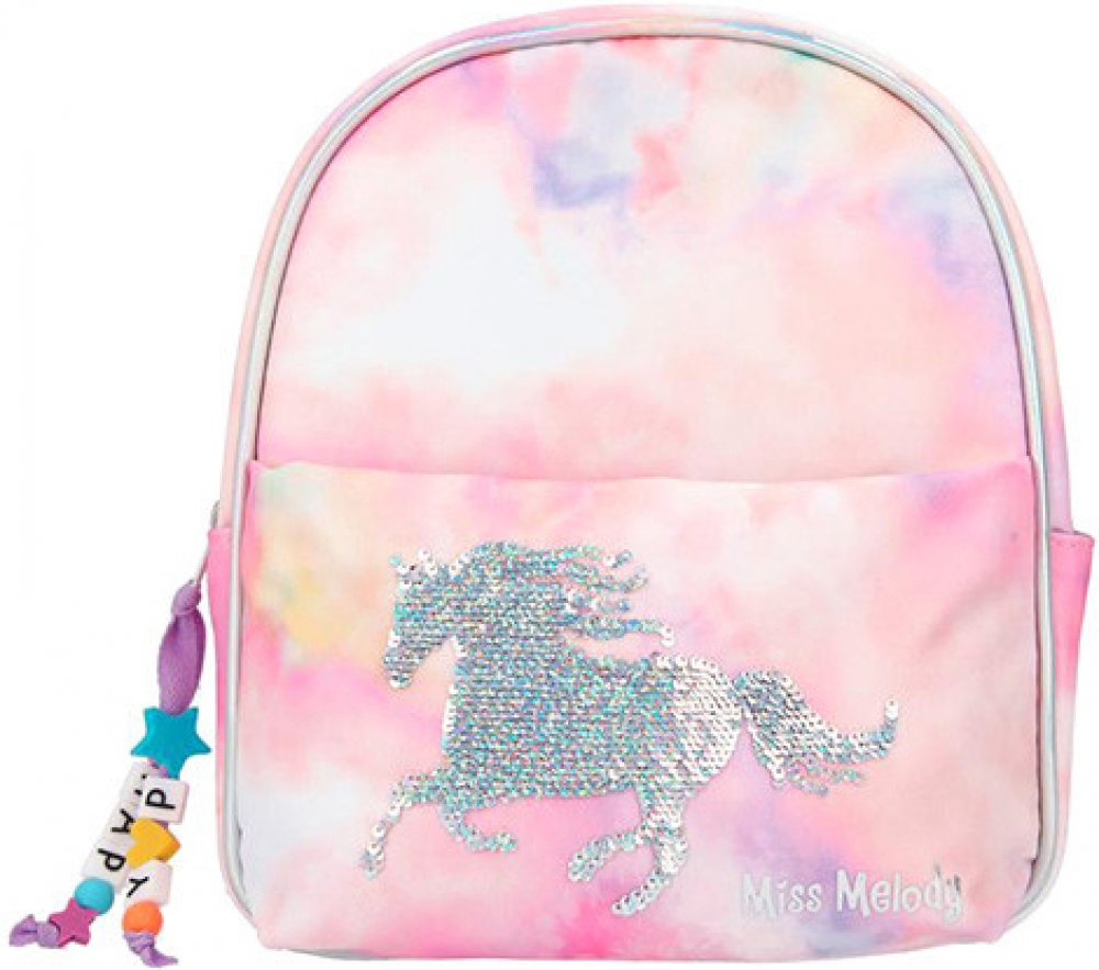 Krásný batikovaný růžovo-fialový holčičí batůžek s obrázkem cválajícího koníka z flitrů, které lze měnit ze stříbrné barvy na fialovou oblíbené značky Miss Melody. Batůžek je vhodný pro volný čas trávený venku s přáteli, nebo například na školní výlet. Hlavní kapsa je uzavíratelná na zip, který je opatřen přívěskem s korálky pro ještě lepší manipulaci, popruhy jsou délkově nastavitelné. Nádherný d...