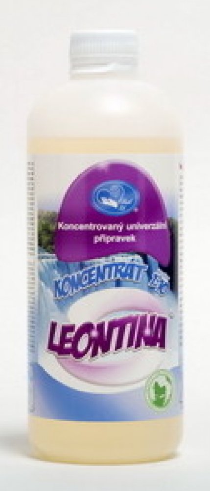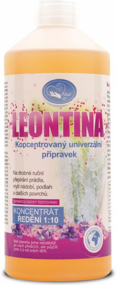 Leontina je ekologický, vynikající, vysoce koncentrovaný, univerzální pěnivý přípravek k víceúčelovému použití – pěna do koupele, sprchový gel, tekuté mýdlo, šampon na vlasy, drobné ruční přepírání, jedinečný při cestování, pomocník při běžném úklidu. Leontina je bezbarvý gel, má příjemnou květinovou vůni, jeho pH je 6 -7. Aktivní látky produktu jsou založeny na bázi derivátů kokosového oleje. Má příznivé účinky na pokožku. Používáním ekologického, univerzálního přípravku Leontina zístkáte: tekuté mýdlo a dlouhotrvající pěnu do koupele zdravou hebkou pokožku a pevné nehty produkt, který nedráždí ani velmi citlivou pokožku lehkou přírodní vůni nahradu za všechny produkty, které potřebujete na dovolenou pomocníka na ruční přepírání jemného prádla, vlny a hedvábí přípravek na čištění drahých kovů, Vaše šperky budou jako nové přípravek na údržbu interiéru automobilu, běžný úklid, vhodný na koupání psů a koček jednodušší údržbu vany, po koupeli stačí vanu pouze opláchnout vodou jednoduchou aplikaci pěny pomocí pěnového ventilu příjemný pocit čistoty těla i obydlí Návod k použití: Přípravek řeďte s teplou vodou dle rysek vyznačených na ředící láhvi v poměru 1:10.