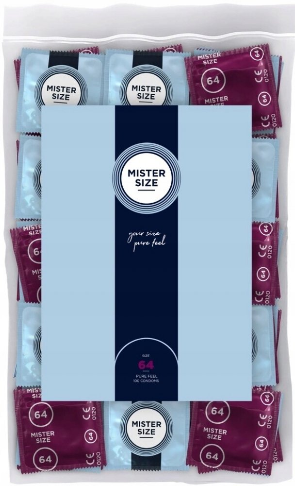 Mister Size 64 mm kondomy jsou vyrobeny z přírodního kaučukového latexu a nabízejí pocit druhé kůže díky extrémnímu tnění o síle 0,055-0,065 mm. Kondomy jsou transparentní a pokryté lubrikantem pro snadné a pohodlné použití. Vybavené jsou špičkou pro sběr semene. S jejich průměrem 64 mm jsou vhodné pro obvod penisu 14,5 až 15,5 cm. Na přední straně balení je měřící škála, která pomůže vybrat správnou velikost. Balení obsahuje 100 kusů kondomů, které jsou ideální pro dlouhodobé zásobení. Jsou veganské, což znamená, že žádný z použitých materiálů nepochází ze živočišných zdrojů. Země původu je Malajsie.