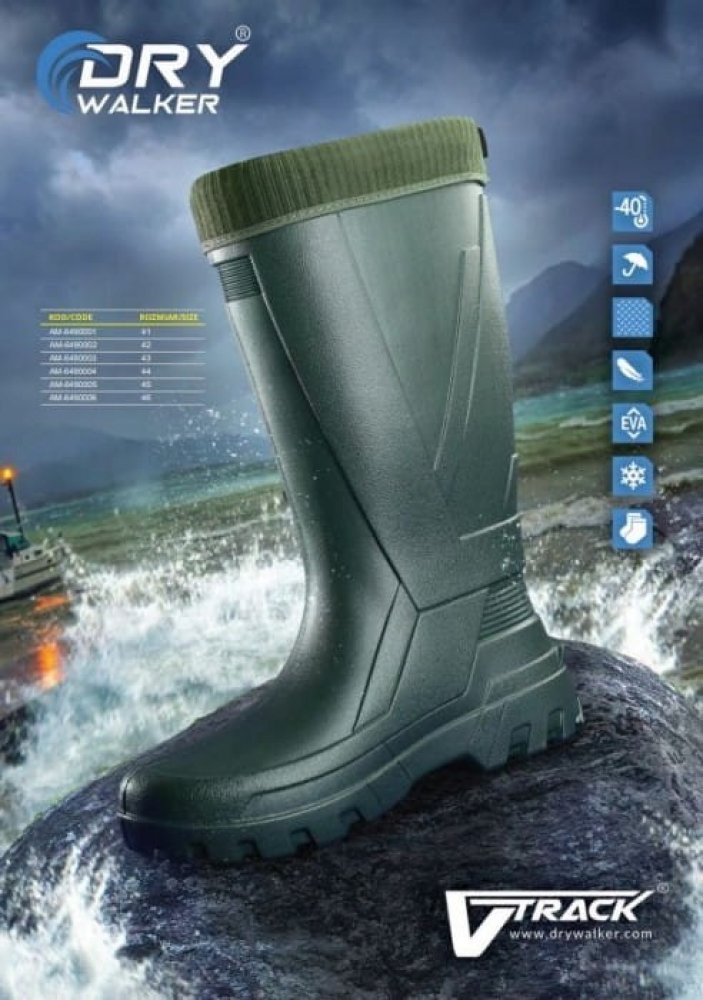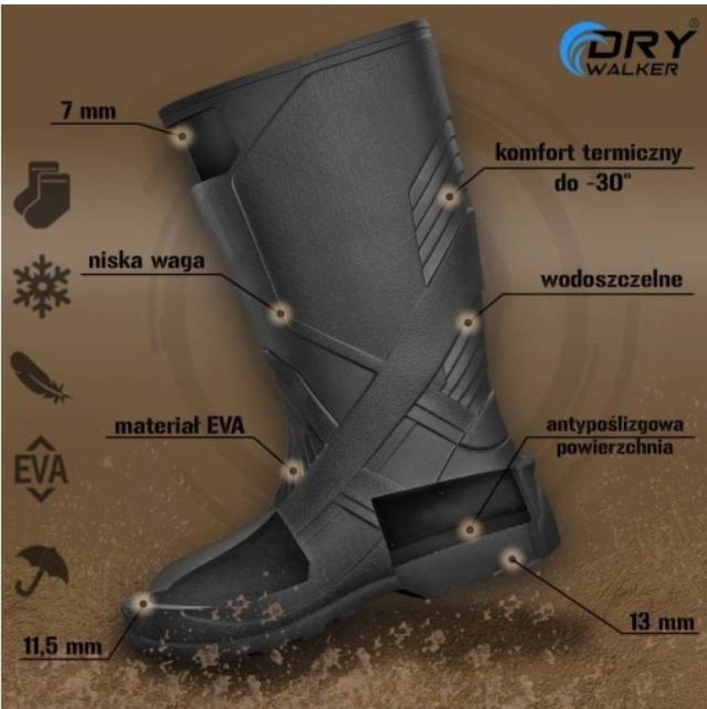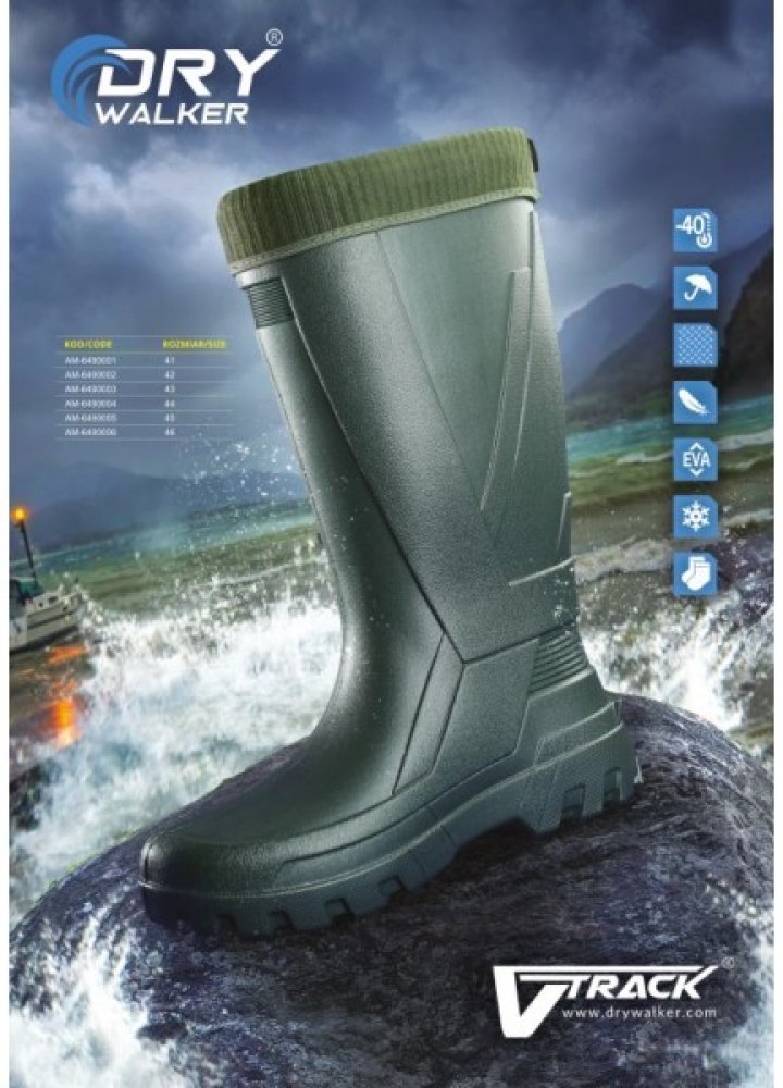 Celoroční holínky s hřejivou vložkou DRY WALKER model Xtrack Short. Vyrobeno z materiálu EVA, který je odolný a přitom lehký a zcela voděodolný. Uvnitř nachází vyjímatelná hřejivá vložka zakončená manšestrem. Speciální absorpční podložka a protiskluzová úprava v podrážce zvyšují komfort používání. Je doplněn protektorem, který zajišťuje dobrou přilnavost na kluzkém blátivém povrchu.