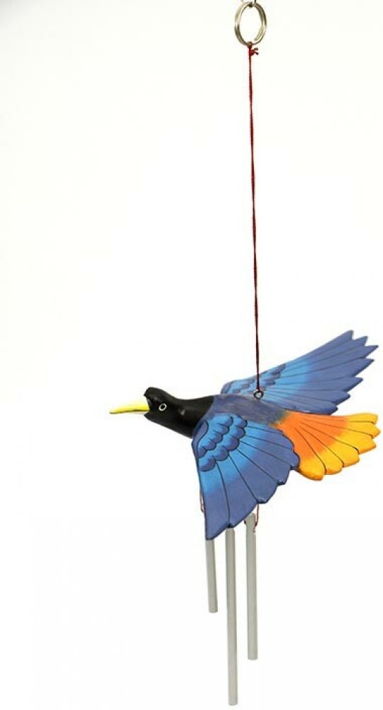 Menší zvonkohra k zavěšení s dřevěným letícím ptáčkem převážně v modré barvě a třemi kovovými trubičkami (délka 4, 6 a 8 cm) s krásně jemným zvukem. Ručně vyrobená dle pravidel fair trade ve vesnici Abuan na ostrově Bali v Indonésii ze dřeva stromu Albízia, který roste v tropickém deštném pralese.