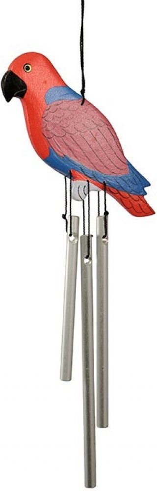 Malá zvonkohra k zavěšení s dřevěným papouškem eklektus různobarvý (eclectus roratus) a třemi kovovými trubičkami (délka 4, 6 a 8 cm) s krásně jemným zvukem. Ručně vyrobená dle pravidel fair trade ve vesnici Abuan na ostrově Bali v Indonésii ze dřeva stromu Albízia, který roste v tropickém deštném pralese.