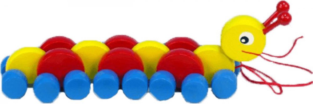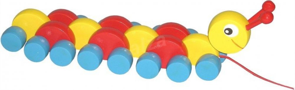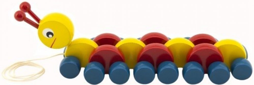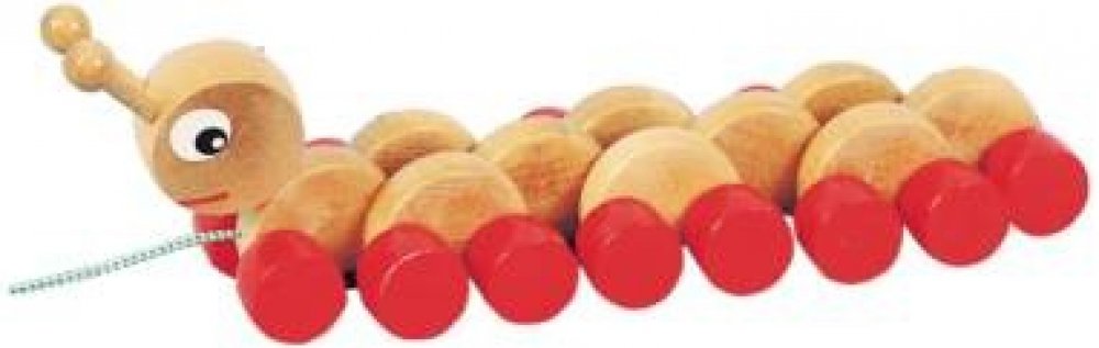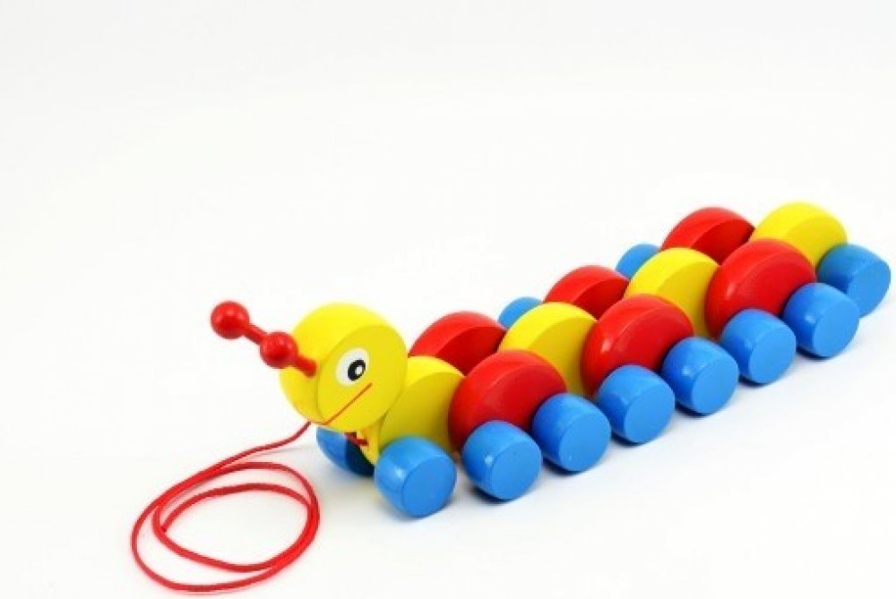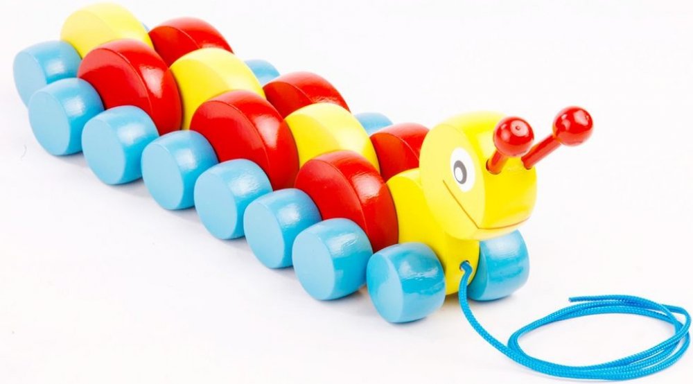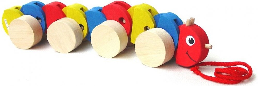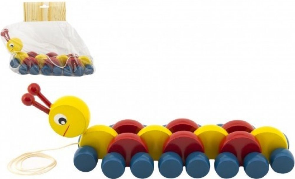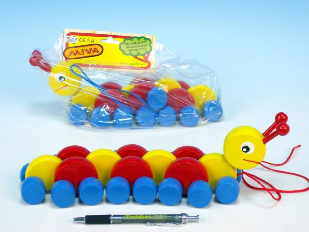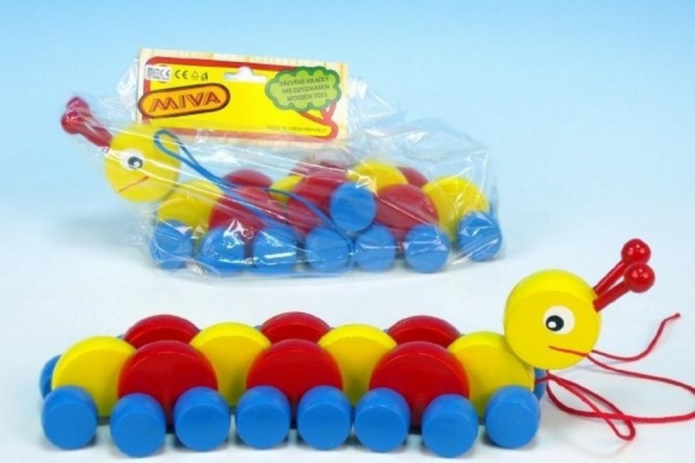 Oblíbená dřevěná tahací hračka ze dřeva na kolečkách pro nejmenší děti, barevná housenka na provázku, která při tažení vlní, jako skutečná. Vyrobeno v Česku.