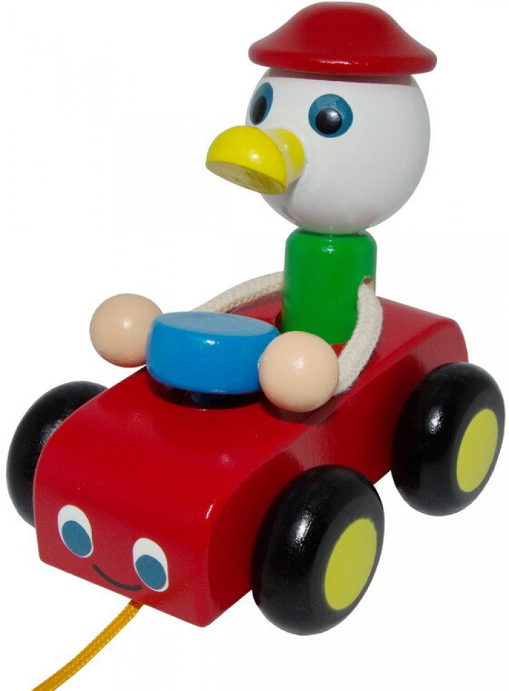 Dřevěný tahací kačer v červeném autě. Postavička se v autě při jízdě kymácí.