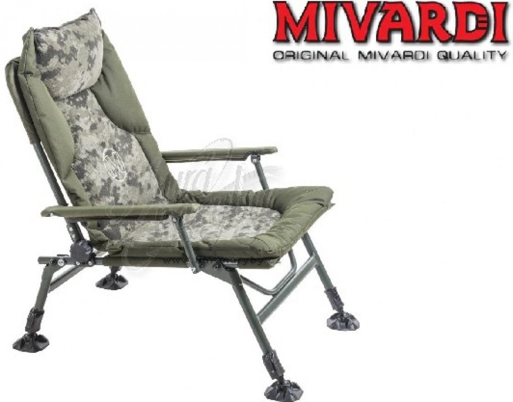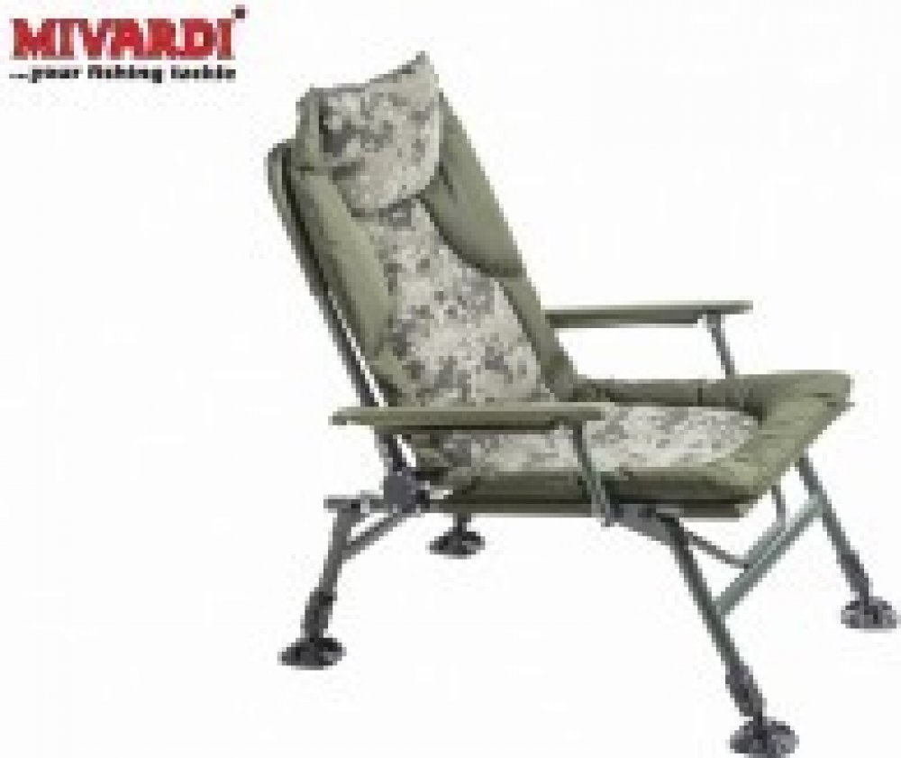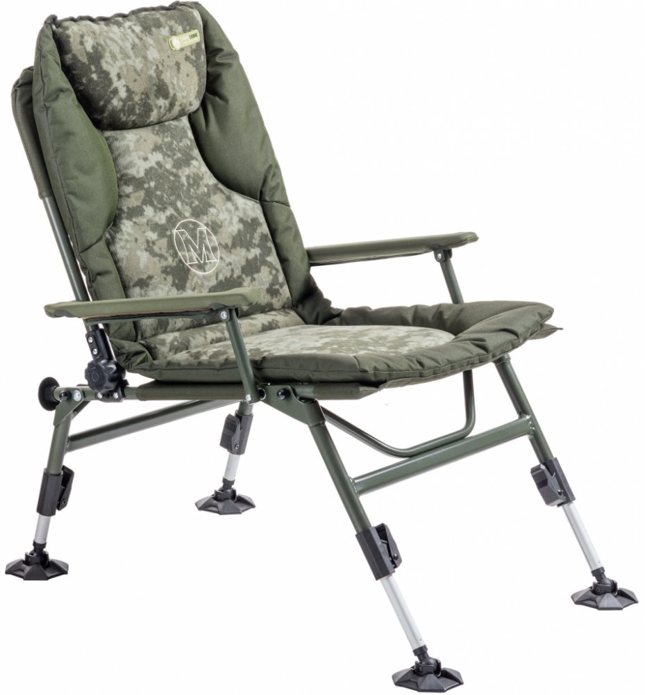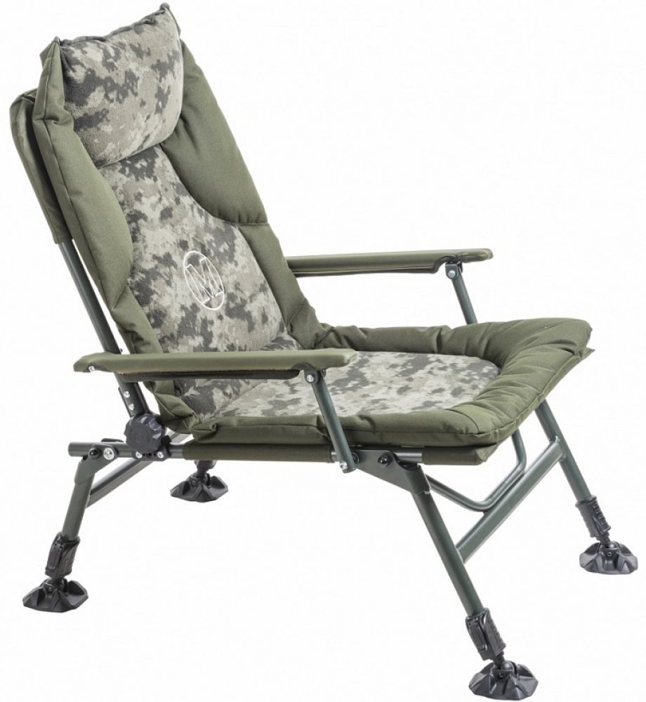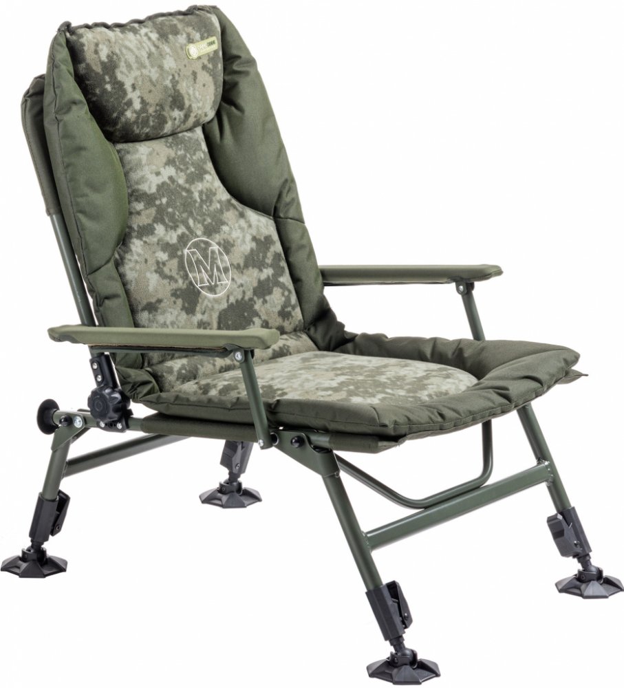 Křeslo je vybaveno čtyřmi teleskopickými nohami s výkyvnými patkami, které zajistí stabilitu i na nerovném terénu. Kvalitní polstrování je potaženo odolným materiálem s camo vzorem Mivardi CamoCODE, který nejen dobře vypadá, ale i skvěle odolává opotřebení. Kompaktní konstrukce umožňuje snadné složení a přepravu.