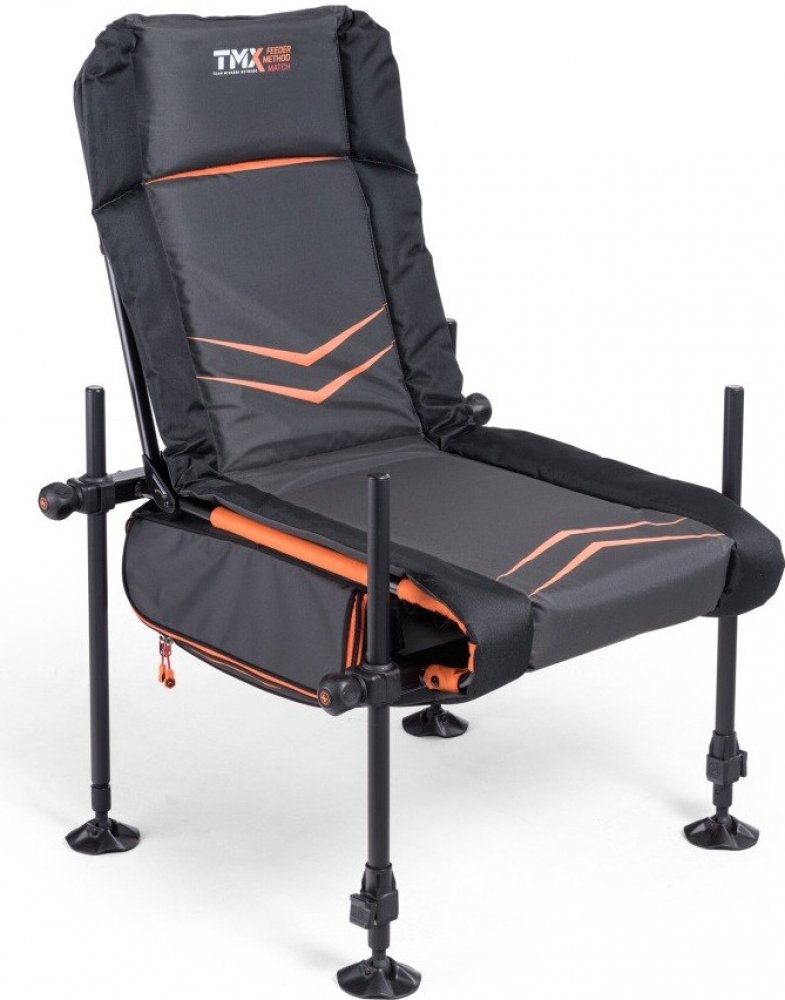 Pohodlná, dokonale stabilní a snadno přenosná. To je sedačka Feeder station TMX. Ergonomický design sedáku i opěradla spolu s kvalitně polstrovanou matrací zajišťují pohodlné sezení. Čtyři nastavitelné nohy se přizpůsobí všem nerovnostem terénu a spolu s vestavěnou libelou umožňují rychlé ustavení sedačky do roviny. Na strmých březích oceníte přední teleskopické nohy i kvalitní výkyvné patky proti zaboření. Sedačka je vybavena velkým úložným prostorem pod sedákem. Zde můžete uložit boční plata, držáky a další příslušenství. Nohy sedačky během transportu vsunete do připravených úchytů v zaoblené přední části sedáku. Opěradlo při přenášení sedačky jednoduše sklopíte a zajistíte ve sklopené poloze pomocí připravené spony. Součástí sedačky je i nastavitelný popruh pro nošení přes rameno.