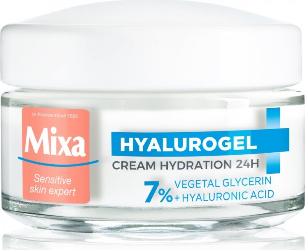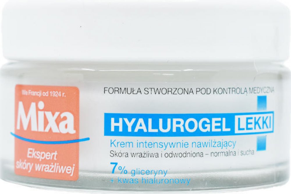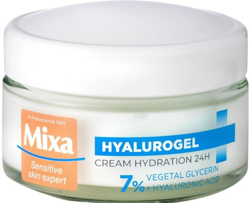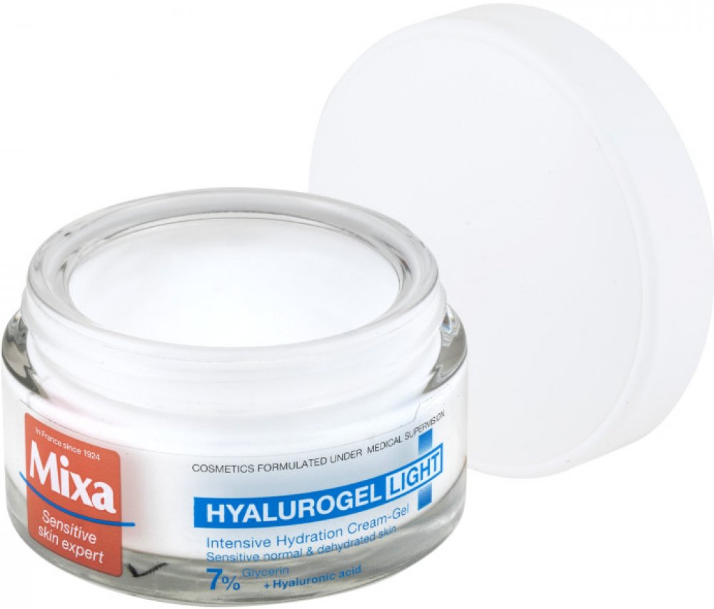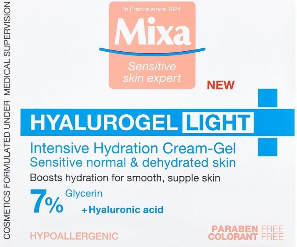 Intenzivní hydratační krém Mixa Hyalurogel Light je kosmetický přípravek vytvořený pro osoby s citlivou pletí, která vykazuje známky dehydratace - únavu, ztrátu pružnosti a ztrátu zářivosti. Okamžitě dodává a udržuje hydrataci pleti po dobu 24 hodin díky složení obohacenému o kyselinu hyaluronovou, která je schopna vázat 1000krát více vody, než váží sama. Lehká krémově-gelová textura se rychle vstřebává, hydratuje pleť a dodává jí pocit komfortu. Nezanechává mastný film a nezpůsobuje černé tečky. Obsahuje 7 % glycerinu a kyselinu hyaluronovou. Složení zvoleno tak, aby se minimalizovalo riziko alergických reakcí. Testováno na snášenlivost na citlivé pleti. Pokožka je okamžitě intenzivně hydratovaná a zklidněná, je jemná a vyzařuje zdravý lesk. Vypadá hladší a pevnější.