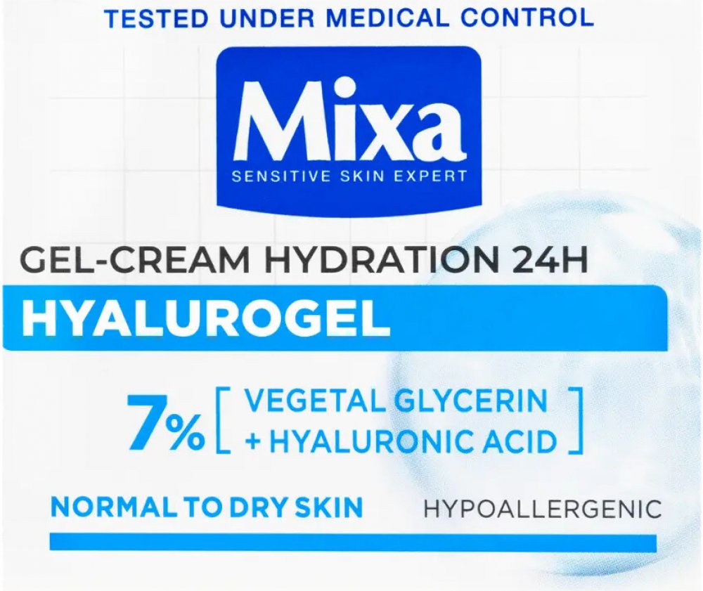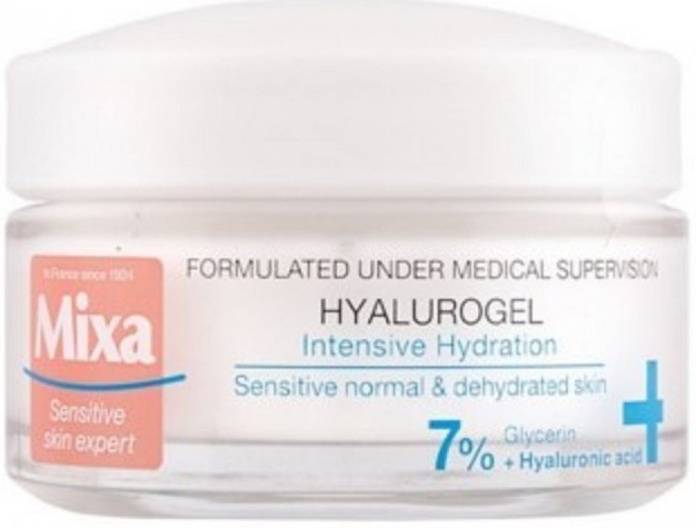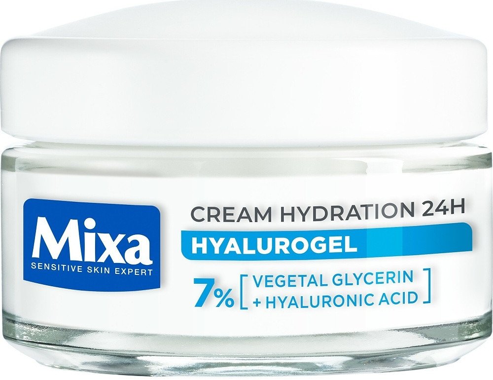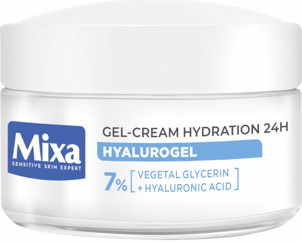 Intenzivní hydratační krém Mixa Hyalurogel Light je kosmetický přípravek vytvořený pro osoby s citlivou pletí, která vykazuje známky dehydratace - únavu, ztrátu pružnosti a ztrátu zářivosti. Okamžitě dodává a udržuje hydrataci pleti po dobu 24 hodin díky složení obohacenému o kyselinu hyaluronovou, která je schopna vázat 1000krát více vody, než váží sama. Lehká krémově-gelová textura se rychle vstřebává, hydratuje pleť a dodává jí pocit komfortu. Nezanechává mastný film a nezpůsobuje černé tečky. Obsahuje 7 % glycerinu a kyselinu hyaluronovou. Složení zvoleno tak, aby se minimalizovalo riziko alergických reakcí. Testováno na snášenlivost na citlivé pleti. Pokožka je okamžitě intenzivně hydratovaná a zklidněná, je jemná a vyzařuje zdravý lesk. Vypadá hladší a pevnější.