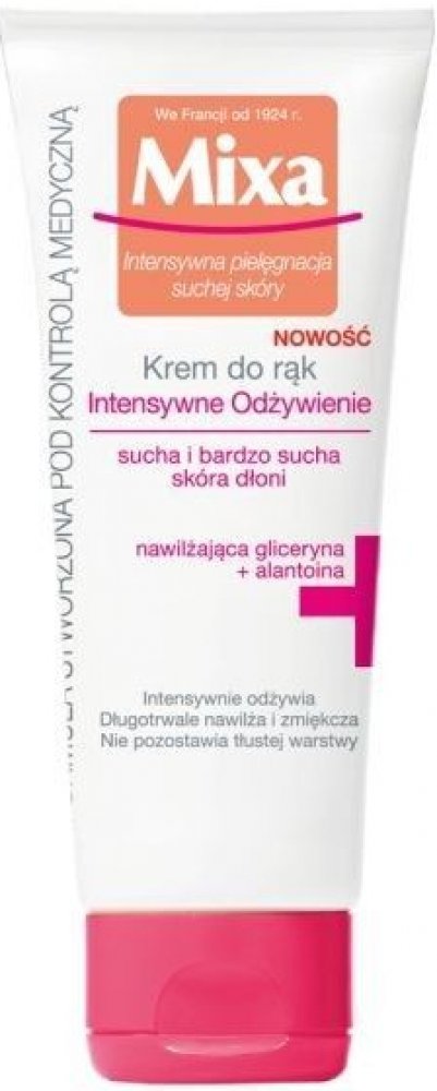 Mixa Intensive Nourishment vyživující krém na ruce obsahuje účinné složky jako glycerin a alantoin které poskytují suché až velmi suché pokožce rukou výživu hloubkovou hydrataci a chrání ji před vysušením Mixa Intensive Nourishment vyživující krém na ruce zanechává ruce vyživené hydratované hebké na dotek a snižuje riziko vzniku alergií