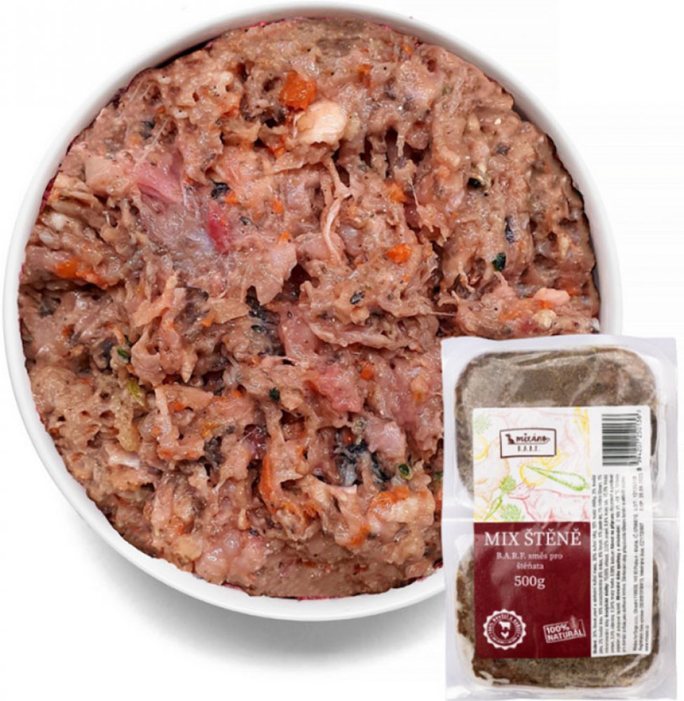 Chutná směs MIX ŠTĚNĚ je vytvořena a namixovaná dle potřeb štěňat a mladých pejsků, které na rozdíl od dospělých potřebují vysokoenergetickou stravu, která obsahuje kvalitní a snadno stravitelné bílkoviny. Strava musí obsahovat dostatečný podíl minerálů, například kalcia, které je důležité pro růst a vývoj kostí. Čerstvá hovězí krev obsahuje vitamíny, stopové prvky a vysoký podíl železa. Směs obsahuje přírodní přípravek Arthro Green (Slávka zelenoústá moučka). Arthro Green je 100% přírodní doplněk výživy pro podporu tvorby a regenerace tkání pohybového aparátu, zejména chrupavek a kloubů. Je vhodný při zvýšené námaze kloubů, během růstu nebo ve stáří.