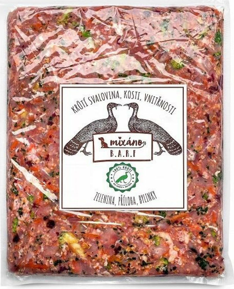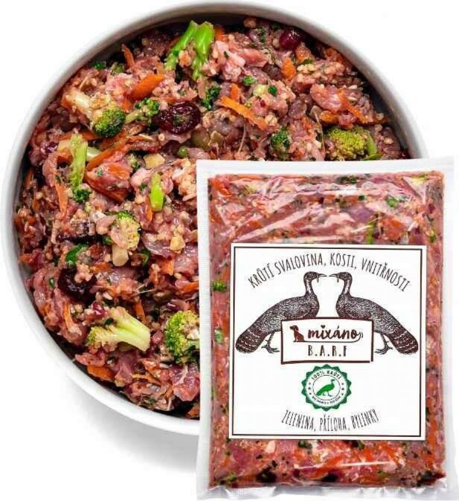 Mixáno BARF KRŮTÍ směs (hrubo mletá) je kompletní krmivo pro pejsky vyrobeno z prvotřídních voňavých surovin. Mixáno BARF již nemusíte ničím doplňovat. Obsahuje vše důležité, co pejsek potřebuje. :) SLOŽENÍ: 70% = Krůtí svalovina, krůtí srdce, krůtí játra, krůtí krky 30% = Mrkev, brokolice, jáhly, petržel. list, brusinky, dýňové semínko PŘÍPRAVA: krok 1 = rozmrazit - ideálně do pokojové teplotykrok 2 = vyklopit do misky :)ANALYTICKÉ SLOŽKY: Vláknina: 0,92 % Sušina: 21,98 % Dusíkaté látky: 12,7 % Tuk hydrolytický: 5,29 % Hrubý popel: 1,19 % Obsah vlhkosti: 78,02 % DOPORUČENÉ DÁVKOVÁNÍ: Dospělák: 3 - 4% ideální váhy pejska Štěněcí rošťák: 4 - 6% ideální váhy pejska