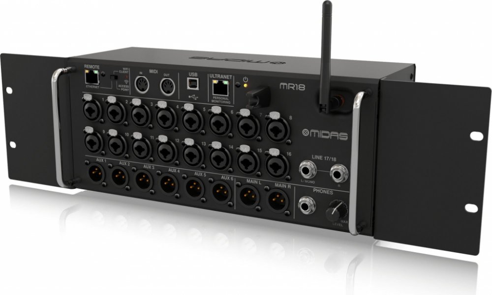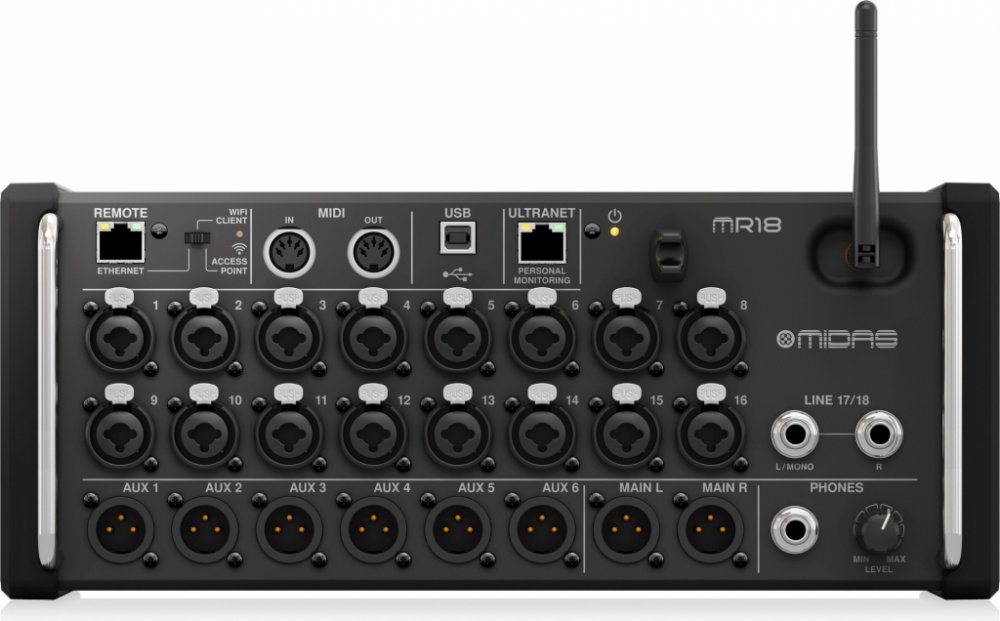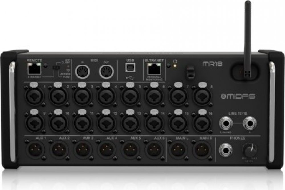 MIDAS MR18 je digitální mixážní pult ze série M-Air s 18 vstupy, z nichž 16 je vybaveno legendárními předzesilovači MIDAS PRO. Mixpult navržený pro práci s iPadem a tablety Android, s integrovaným WiFi modulem a vícekanálovým USB audio rozhraním.