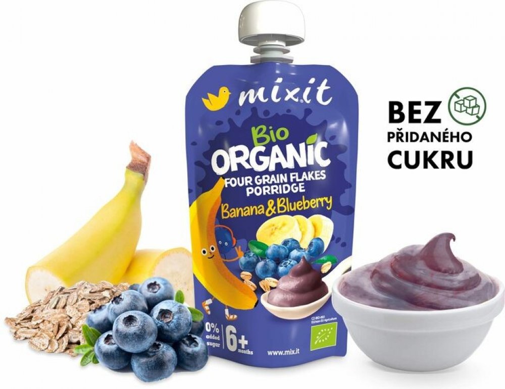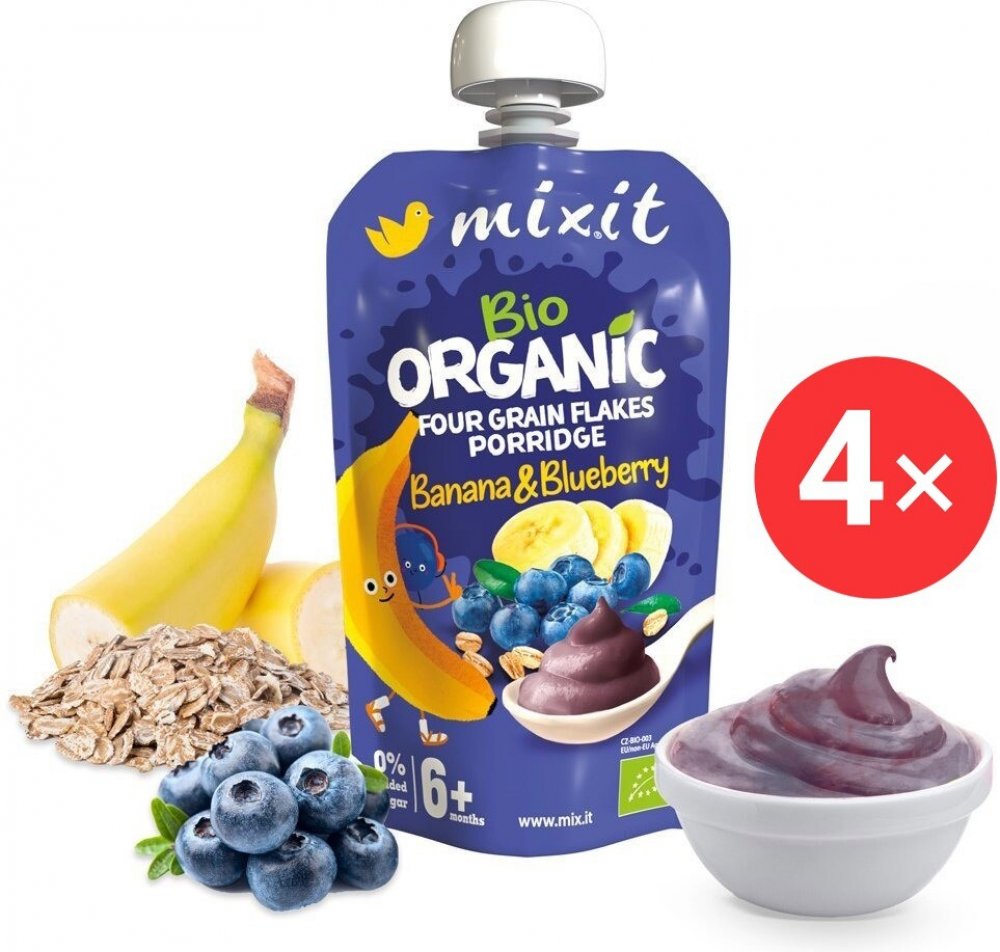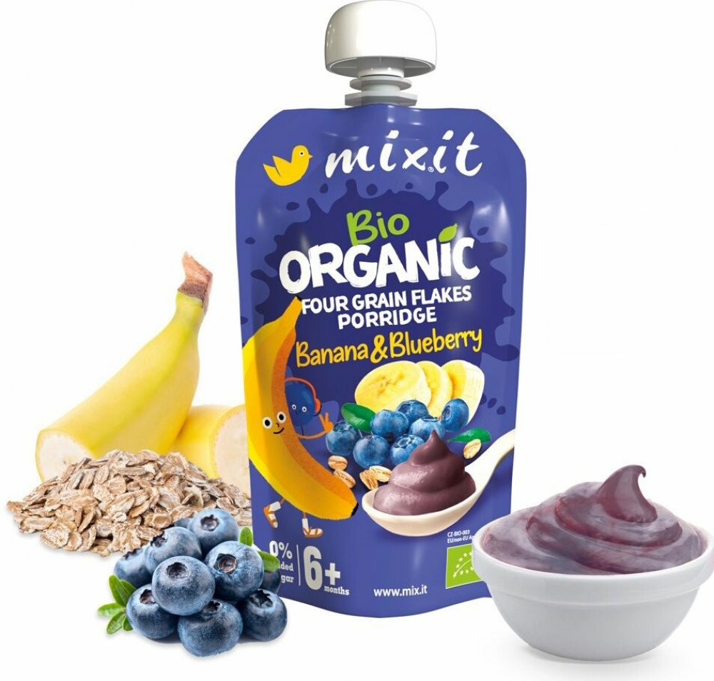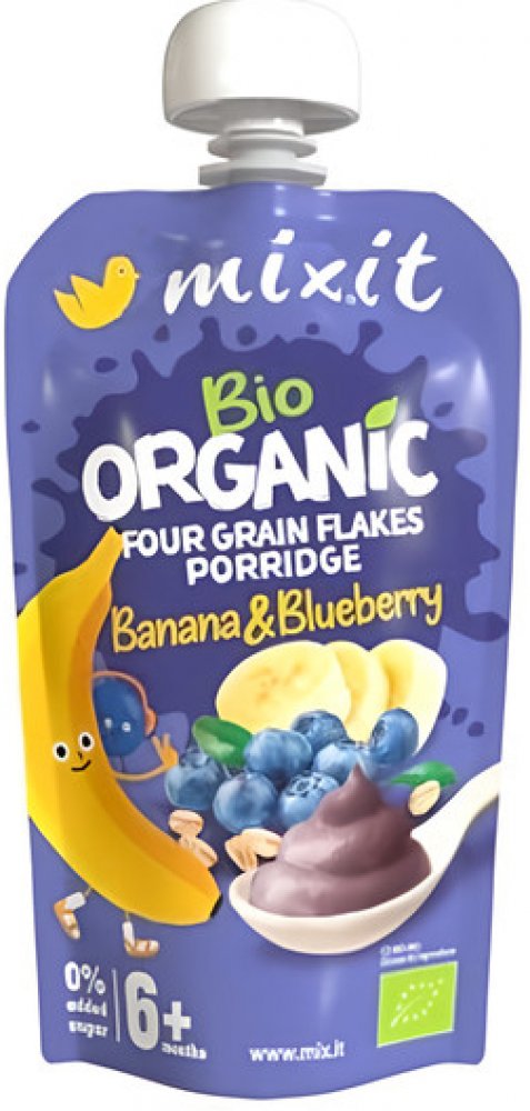 Když jde o naše malé Mixiťáky, chceme pro ně jen to nejlepší. Proto jsme do této kaše dali kromě bio banánu a bio borůvek také bio vločky z ekologického zemědělství. Pro dodání komplexních živin jsme zvolili rovnou čtyři druhy vloček – žitné, ovesné, pšeničné a ječné. A ovoce přirozeně sladké a dokonale zralé. V této kaši najdete jen ty nejlepší ingredience, žádné zbytečné přísady. Nepřidali jsme žádný cukr ani konzervanty, protože věříme, že pro děti je nejlepší to nejpřirozenější. Kapsička je znovu uzavíratelná, připravená na cesty i na doma a není potřeba ji ohřívat. Je tak ideální pro všechny malé Mixiťáky, už od ukončeného 6. měsíce.