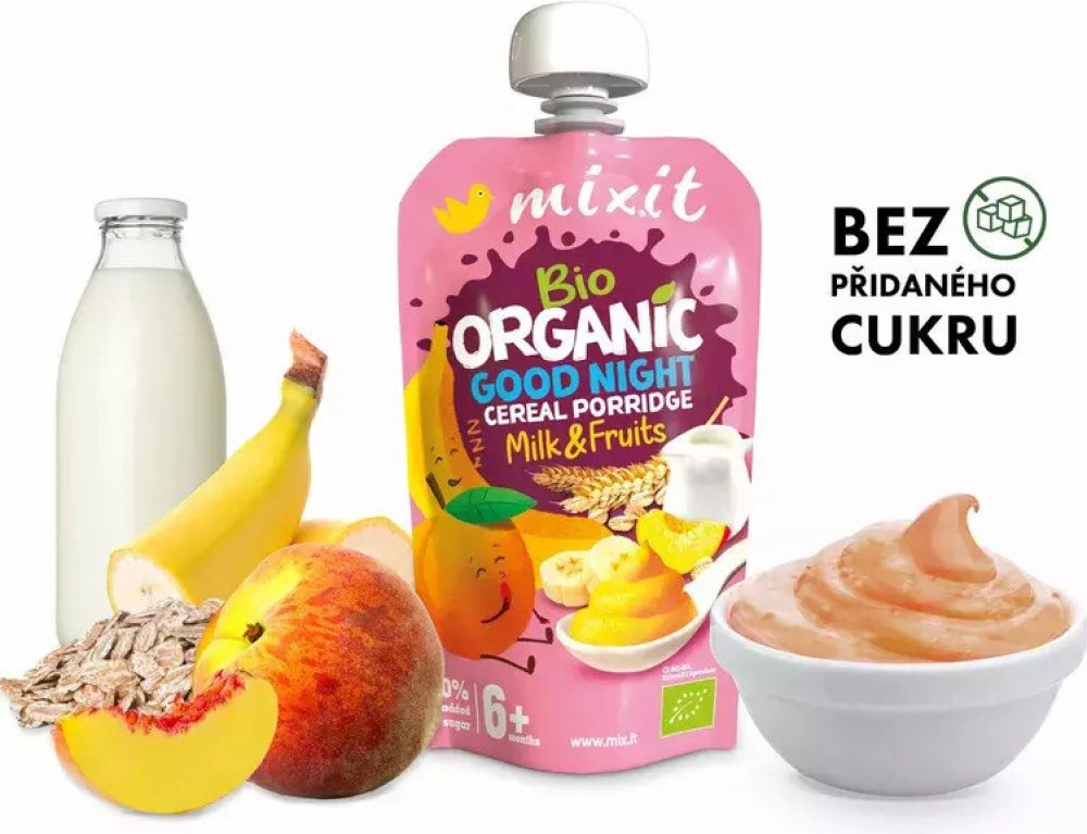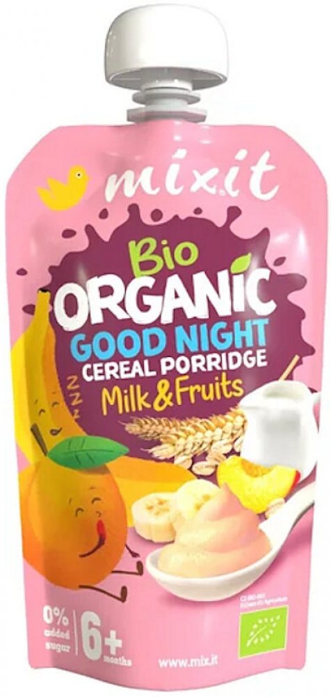 MIXIT BIO kapsička - Good night 110 g Když jde o malé Mixiťáky, zaslouží si jen to nejlepší. Tato kaše proto obsahuje pouze vysoce kvalitní bio mléko, bio banán, bio broskev a bio ovesné vločky z ekologického zemědělství. Ovoce je přirozeně sladké a dokonale zralé.