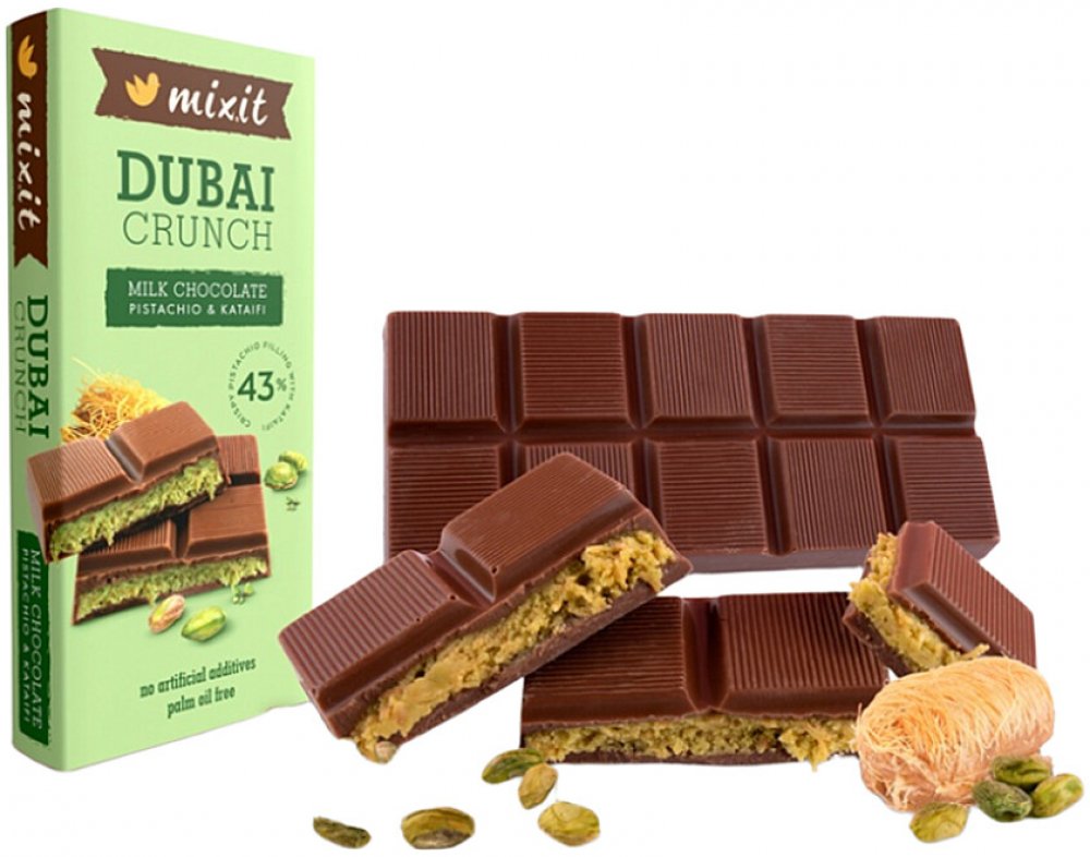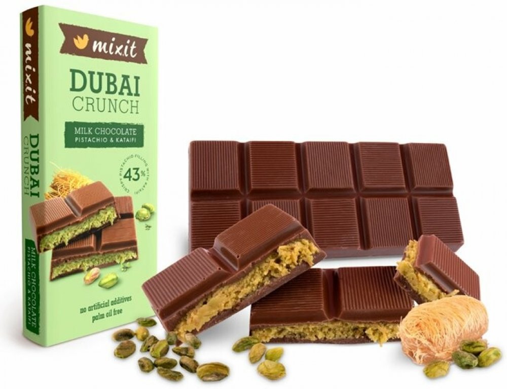 Dubajská čokoláda je trend, který pobláznil snad celý svět. Ta naše sice není přímo z Dubaje, ale snadno vás do téhle exotiky přenese. Vzali jsme totiž mléčnou čokoládu Mixit a naplnili ji až po okraje naším pistáciovým krémem s jemným křupavým kataifi.