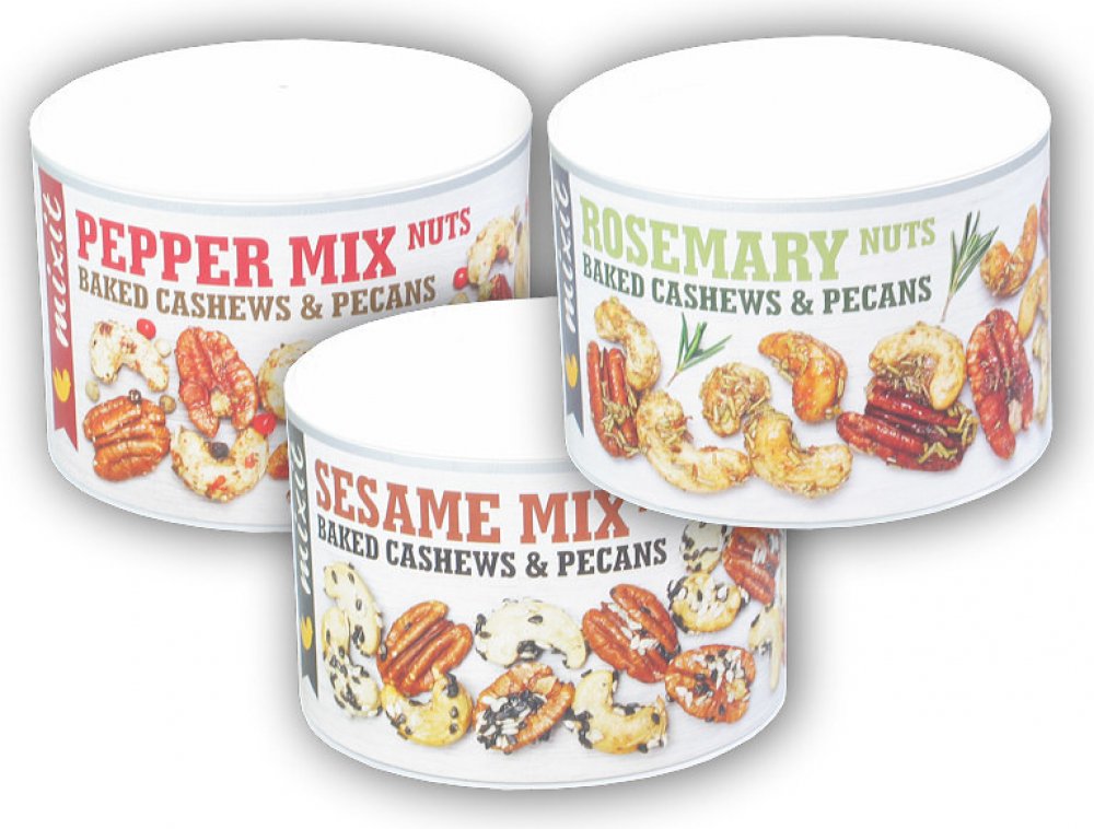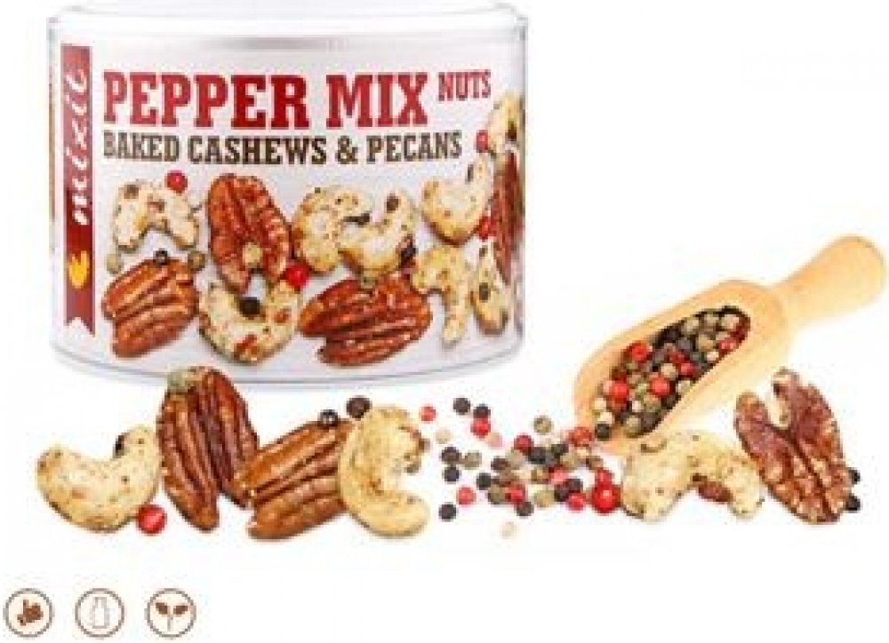 Složení: kešu ořechy 59,6%, pekanové ořechy 28,9%, vláknina z kořene čekanky 7%, sůl himalájská 2,6%, pepř barevný 2%