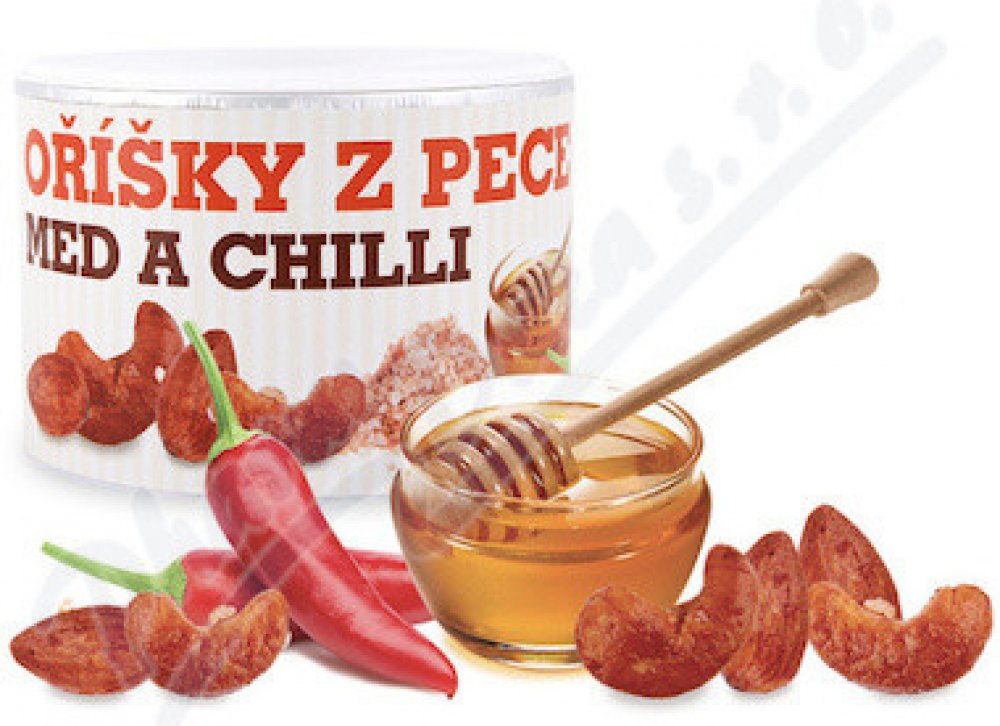jádra kešu ořechů 59 %, jádra mandlí 31 %, med 8,2 %, sůl, chilli mleté 0,6 %