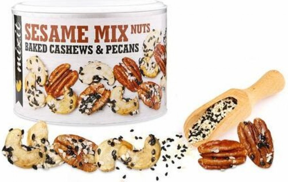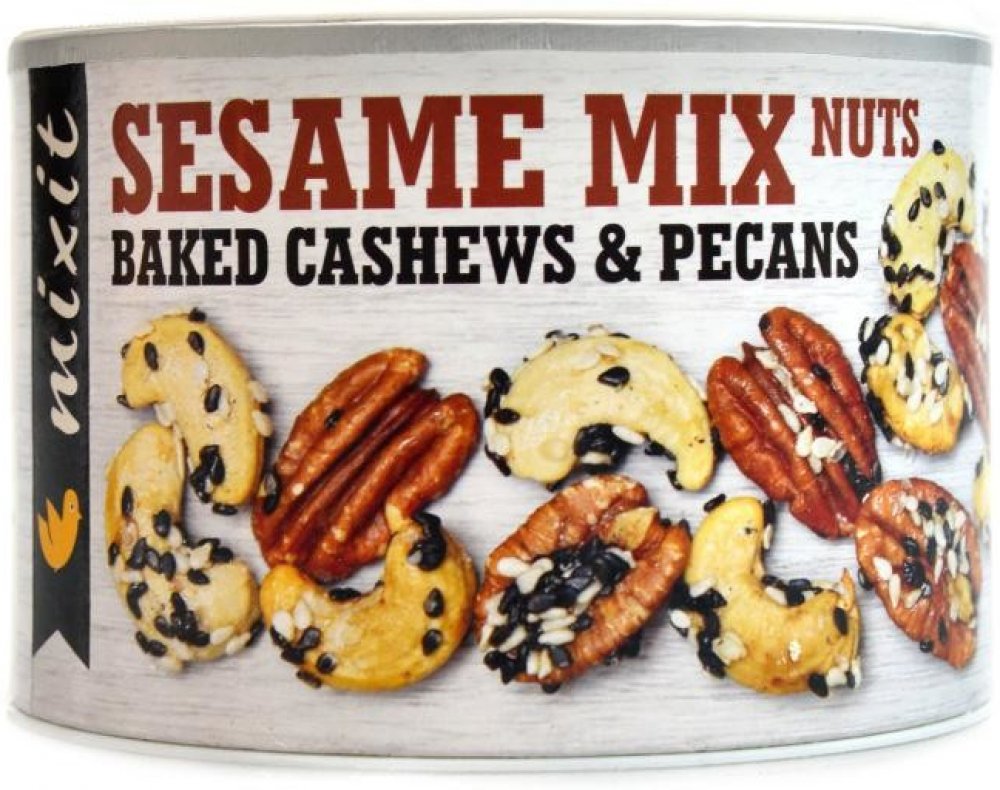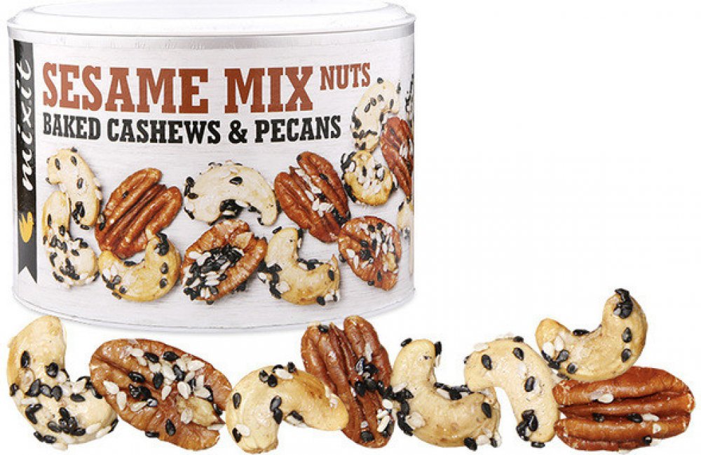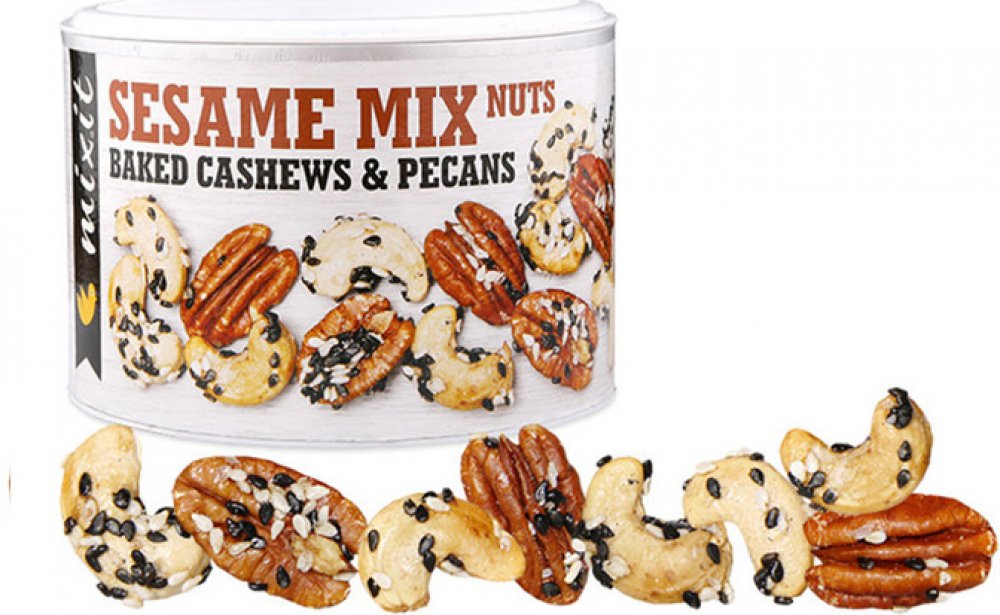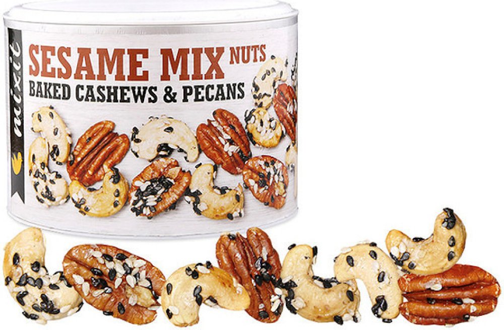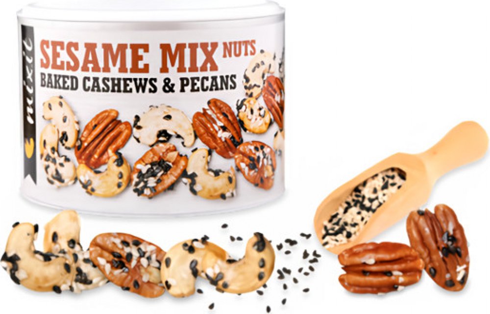 Pečená novinka. Už jste to slyšeli? Černý a bílý sezam to spolu pečou v Mixit! A rozhodně to není neslané. Postará se o to růžová hrubozrnná sůl! Vypečená kombinace kešu a pekanových ořechů je gurmánským zážitkem k dobrému nápoji nebo jen tak večer u filmu. Doporučujeme!