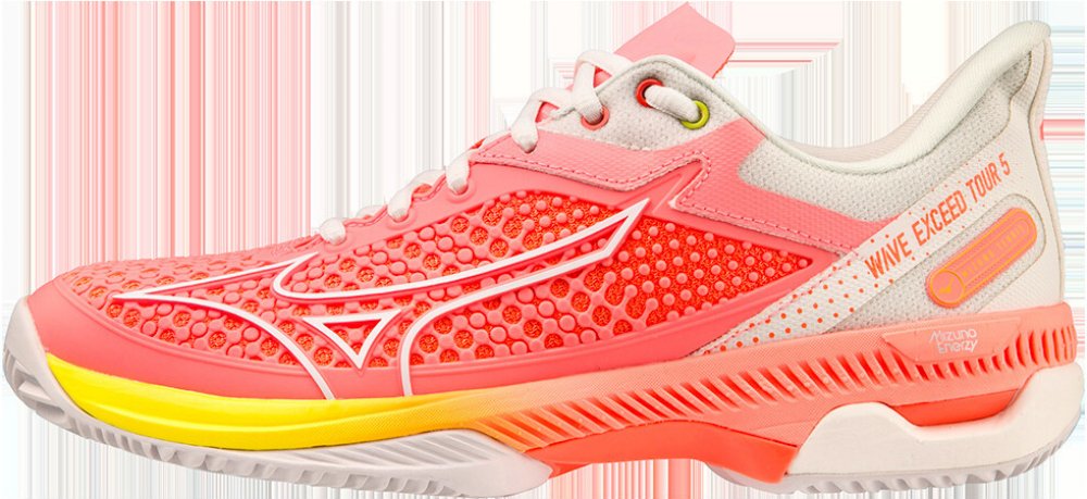 Dámské tenisové boty Mizuno Wave Exceed Tour 5 CC - candy coral/snow white/neon flame Model Wave Exceed Tour 5 byl vyroben z vysoce kvalitních materiálů a s použitím pokročilých technologií. Je určen pro náročné hráče, pro které je nejdůležitější perfektní odpružení, stabilizace a odolnost. Svršek vyrobený z vysoce kvalitního syntetického materiálu s velkým množstvím otvorů zajišťuje správné držení nohy a ventilaci. Speciální kompozitní vložka Mizuno Wave, která se vyznačuje vynikajícím profilováním po celé délce boty, zaručuje skvělé odpružení a správně chrání nohu. Mezipodešev z měkkého materiálu Mizuno Enerzy přispívá k výbornému komfortu a lépe vrací energii, což umožňuje rychlejší, energičtější odraz. Byly použity také technologie: 3D-SOLID, D-FLEX GROOVE, POWNCE. S ohledem na profil běhounu jsou boty určeny pro hru na antukových kurtech.