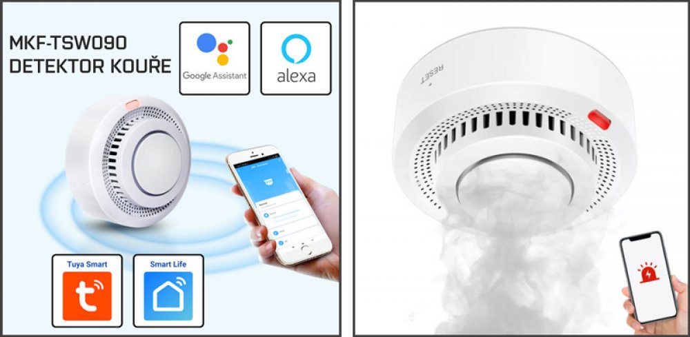 Tuya WiFi smart inteligentní detektor kouře pro detekci požáru, detekční dosah 20 m2, baterie 2× 1,5V AAA, akustická siréna s úrovní 90 db/1m, zasílá bezpečnostní zprávy, připojení Wi-Fi 2,4 GHz, ovládání mobilní aplikaci SMART LIFE® nebo TUYA, trvalý monitoring hlídaného prostoru