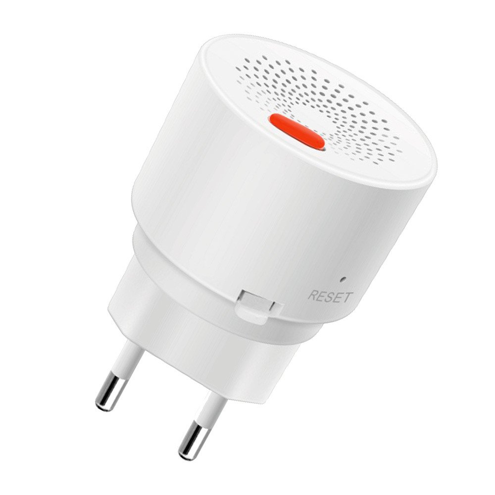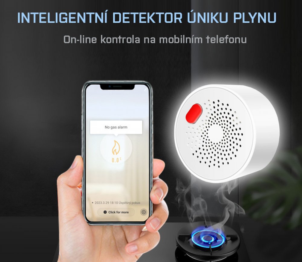 Tuya WiFi smart inteligentní detektor zemního plynu a Metanu (CH4) určený pro detekci uníku plynu, akustická siréna s úrovní 70 db/1m, zasílá bezpečnostní zprávy, připojení Wi-Fi 2,4 GHz, ovládání mobilní aplikaci SMART LIFE® nebo TUYA, trvalý monitoring hlídaného prostoru