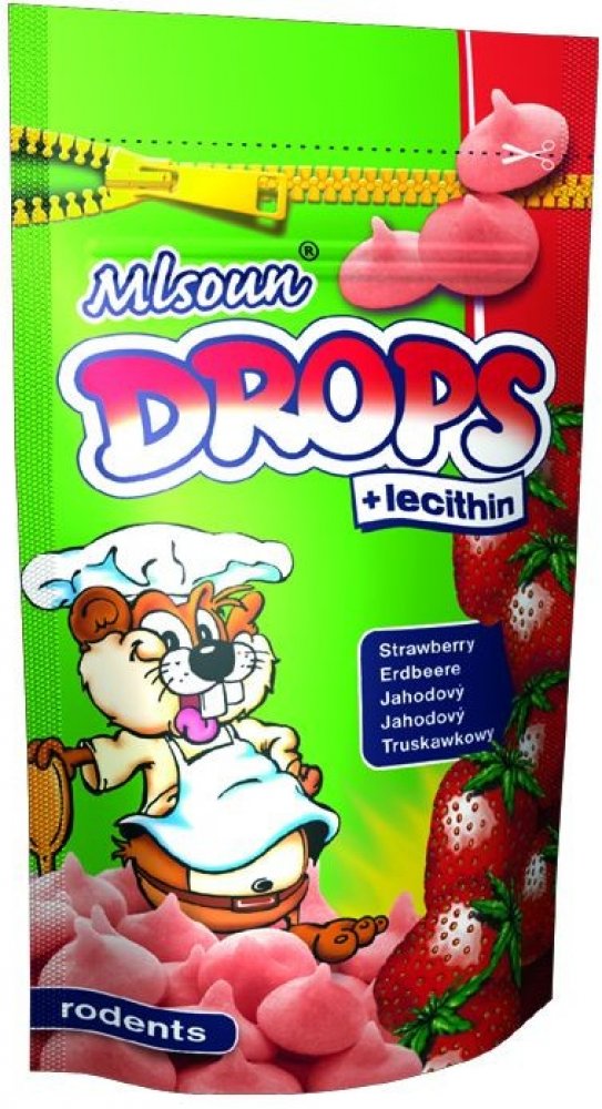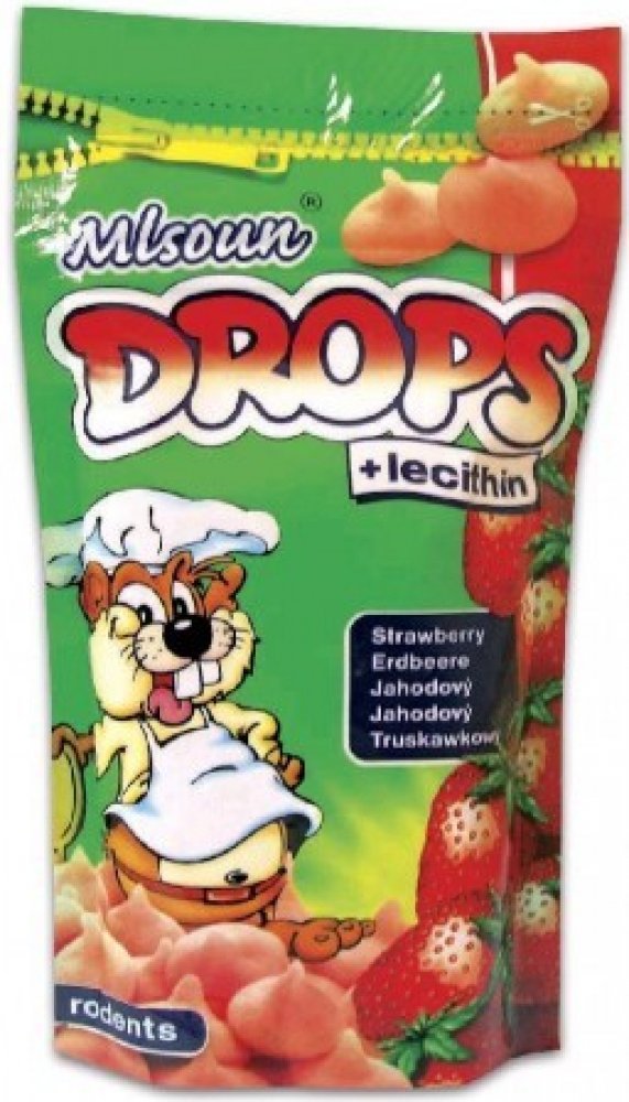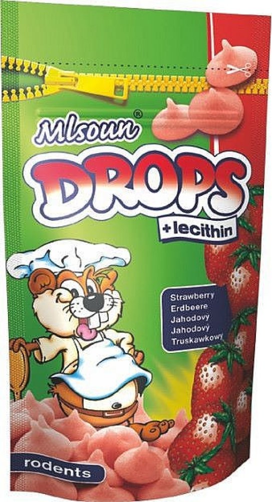 Jahodová pochoutka pro hlodavce obohacená lecithinem ve formě dropsů. Doplňkové krmivo pro hlodavce. Složení: obiloviny, cukry, tuky a oleje, sušená syrovátka, sušené mléko, lecithin E322, aroma, minerály, barvivo E124 červené. Návod ke krmení: slouží jako pochoutka. Hmotnost: 75 g/sáček 12 ks balení/karton