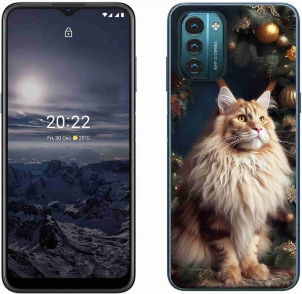 Vánoční pouzdro na Nokia G11/G21 - kočka u stromku poskytuje všechny výhody gelových krytů, a to v zajímavém designu.