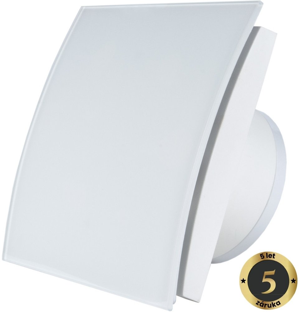Tichý ventilátor do koupelny - ⌀ 100 mm (průměr), časový doběh (pevný - 5 minut), axiální konstrukce, kuličková ložiska, max. průtok 90 m3/h, barva bílá, příkon 16 W, krytí IP X4, hlučnost 27 dB/A, AC motor, umístění (do - koupelen / toalet / kuchyní), otáčky 2500/min, elegantní minimalistické zpracování, napětí 230 V / 50 Hz, nadstandardní záruka 5 let, rozměry 170 × 170 mm (Š×V), hmotnost ~ 2 kg...