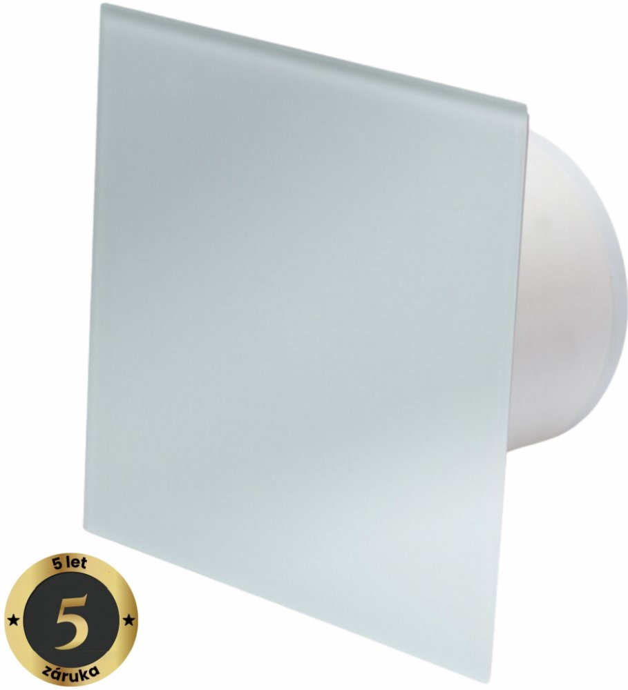 Tichý ventilátor do koupelny - ⌀ 100 mm (průměr), axiální konstrukce, kuličková ložiska, max. průtok 90 m3/h, barva bílá, příkon 16 W, s časovým doběhem, krytí IP X4, hlučnost 27 dB/A, umístění (do - koupelen / toalet / kuchyní), otáčky 2500/min, elegantní minimalistické tělo, napětí 230 V / 50 Hz, nadstandardní záruka 5 let, rozměry 163 × 163 mm (Š×V), hmotnost ~ 2 kg