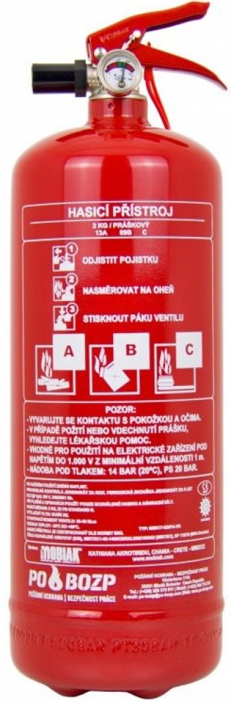 Hasicí přístroj práškový 2 kg je vhodný především jako pojistka pro případ požáru do nákladních a osobních automobilů, lze jej použít také v domácnostech, garážích nebo chatách. Jedná se o přístroj pod stálým tlakem a hodnotu tlaku je možné kontrolovat na manometru instalovaném do ventilu.