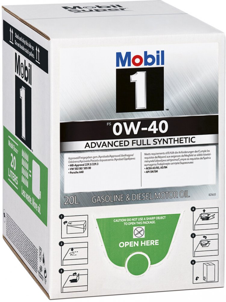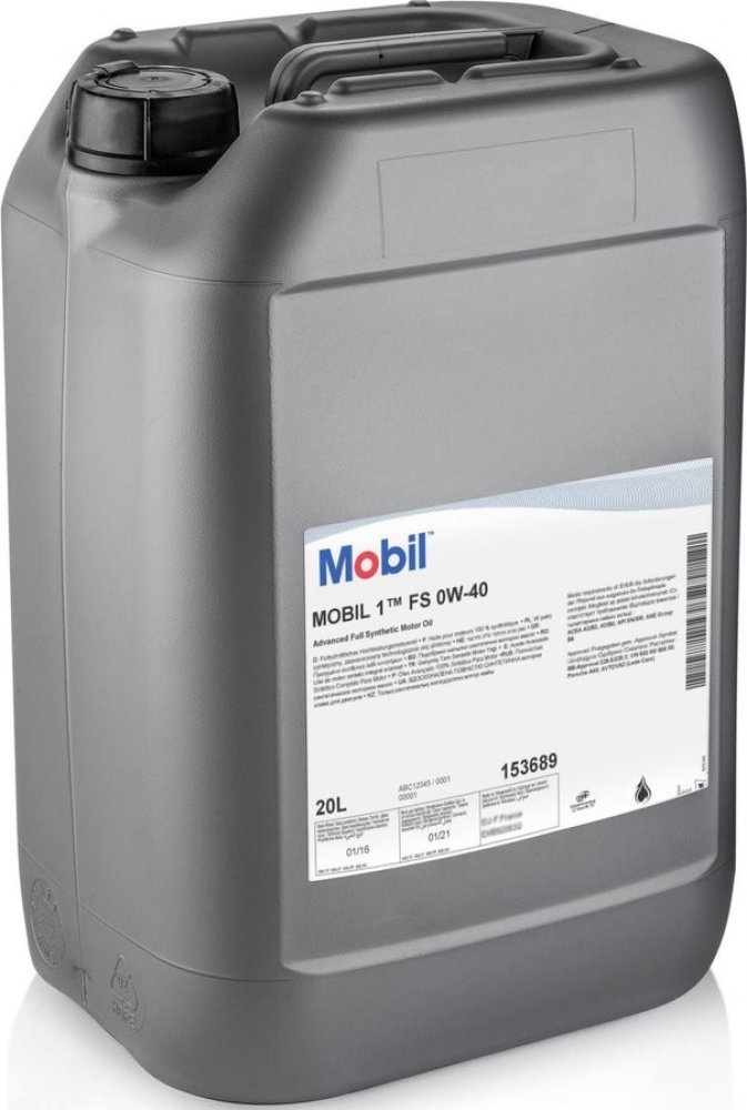 Popis produktu: Mobil 1™ je přední světová značka syntetických motorových olejů zaručujících vynikající výkon a ochranu motorů. Mobil 1™ FS 0W-40 je plně syntetický motorový olej navržený pro nejnovější benzínové a naftové motory (bez filtru pevných částic DPF) pokrokovou technologií zaručující vynikající výkon který poskytuje motoru maximální čistící schopnosti, ochranu proti opotřebení a celkově zlepšuje jeho chod. Mobil 1™ FS 0W-40 udržuje motor tak, že běží jako nový za všech jízdních podmínek. Vlastnosti a výhody: Mobil 1™ FS 0W-40 je vyroben z patentované směsi ultra vysoce výkonných syntetických základových olejů, doplněných přesně vyváženým systémem komponent. Splňuje nebo překračuje nejnovější výrobců OEM a průmyslová schválení. Poskytuje vynikající celkovou výkonnost. Má vynikající schopnosti mazání za nízkých teplot pro rychlou ochranu motoru při rozjezdu. Má lepší třecí vlastnosti, které pomáhají snížit spotřebu paliva. Poskytuje rychlou ochranu pro snížení opotřebení motoru i v extrémních jízdních podmínkách. Poskytuje výjimečnou čisticí schopnost pro špinavé motory. Díky rozsáhlé kooperativní vývojové práci s významnými výrobci a použití nejnovější technologie mazání je Mobil 1™ FS 0W-40 doporučen pro mnoho druhů moderních vozidel, kde tyto vlastnosti pomáhají zajistit nepřekonatelný výkon i za velmi náročných jízdních podmínek. Nejnovější technologie motorů včetně motorů s turbodmychadly, přímým vstřikováním paliva, dieselové motory (bez DPF) a hybridy. Vysoce výkonné motory. Většina provozních podmínek, od mírných až po extrémní. Vždy se poraďte se svým návodem k obsluze a zkontrolujte doporučenou viskozitní třídu a specifikace pro konkrétní vozidlo.
