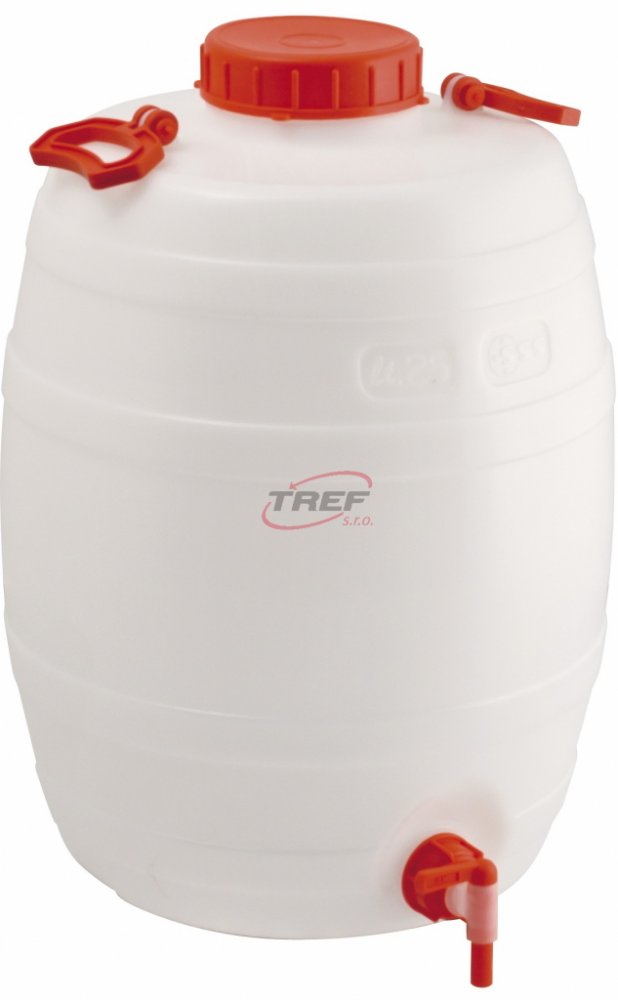 Plastový kanystr o objemu 50l ve tvaru soudku s uchy a výpustným kohoutkem, vyrobený z nebarveného zdravotně nezávadného polyethylenu HDPE. Je vhodný na potraviny, jako sud na kvašenou šťávu, na burčák apod.