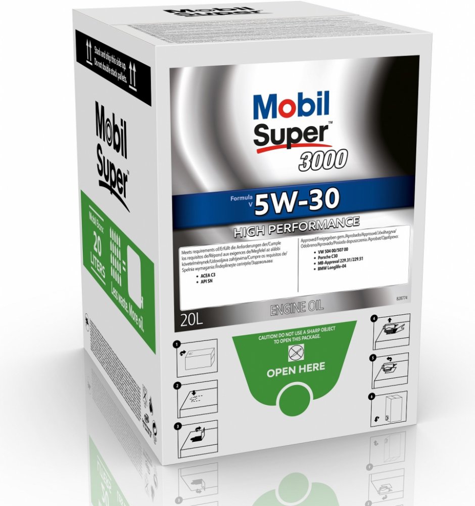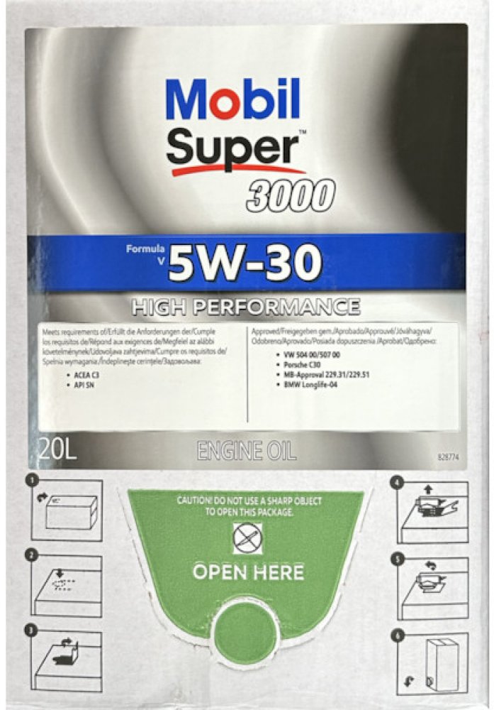 Mobil Super 3000 Formula V 5W-30 je vysoce výkonný plně syntetický olej určený pro benzínové i naftové motory osobních a lehkých užitkových vozidel. Tento olej byl vyvinut tak, aby splňoval požadavky na prodlužené výměnné lhůty a současně udržoval vynikající čistotu motoru a snižoval spotřebu paliva. Mobil Super 3000 Formula V byl vyvinut pro potřeby nejnovějších motorů skupiny VW-Audi, kde jsou požadovány prodloužené výměnné lhůty.