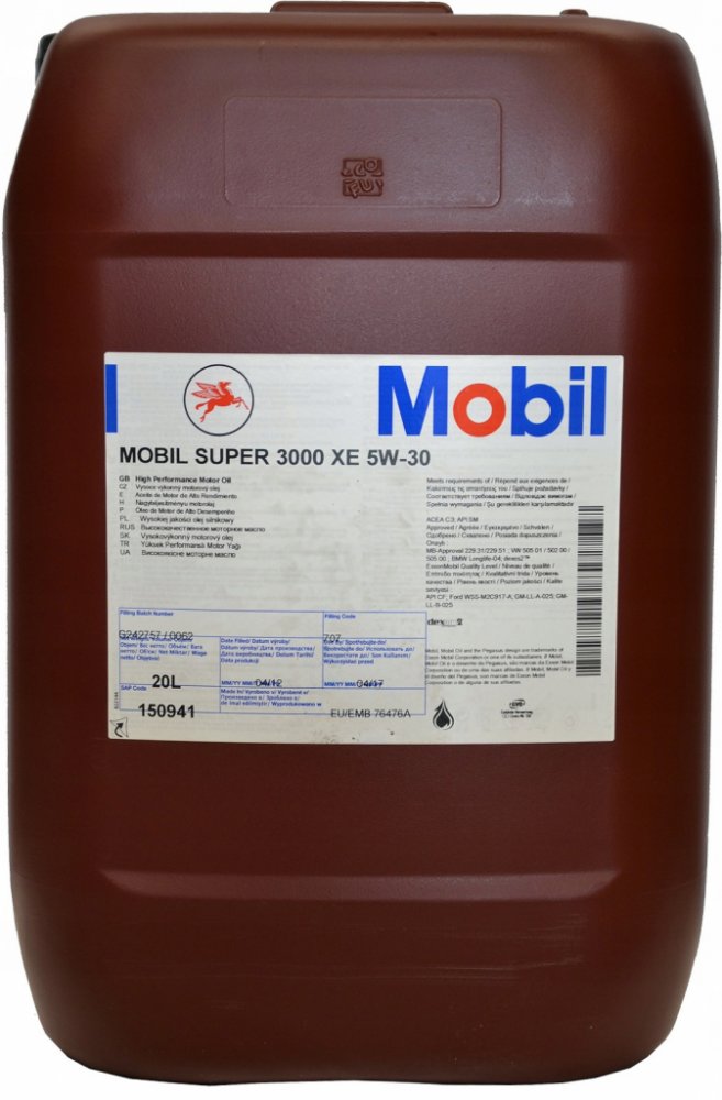 Mobil Super 3000 XE 5W-30 je moderní vysoce výkonný syntetický olej s nízkým obsahem popela. Je navržen tak, aby motoru poskytoval vynikající čistící schopnosti, ochranu proti opotřebení, zlepšoval jeho výkon a především prodlužoval životnost a účinnost systémů pro snížení emisí jak u zážehových tak i vznětových motorů. Mobil Super 3000 XE 5W-30 byl vyvinut dle nejnovějších požadavků významných výrobců vozidel a je kompatibilní s většinou nejnovějších filtrů pevných částic vznětových motorů tak i s katalyzátory zážehových motorů. Je doporučován pro nejmodernější typy automobilových motorů, zvláště pro výkonné zážehové i vznětové motory. Mobil Super 3000 XE 5W-30 nabízí vynikající výkonnost za velmi vysokých i velmi nízkých teplot a dlouhodobou ochranu motoru před opotřebením, tvorbou kalů a úsad. Mobil Super 3000 XE 5W-30 je specificky doporučen pro použití ve vozidlech Mercedes Benz (vyžadujících schválení MB 229.31 nebo 229.51), ve vozidlech BMW (požadující Longlife Oil 04) a také vozidlech Volkswagen (vyžadujících schválení VW 502 00 / 505 00). Mobil Super 3000 XE 5W-30 je také určen pro použití v motorech Volkswagen TDI čerpadlo-tryska (se servisním intervalem : 15 000 km / 1 rok) vyžadujících normu VW 505 01 a pro Ford Galaxy 1.9L Turbo Diesel vyžadující VW 505 01 nebo Ford WSS-M2C917-A schválení. Mobil Super 3000 XE 5W-30 je také vhodný pro aplikace vyžadující novou specifikaci General Motors / Opel / Vauxhall low ash specification.