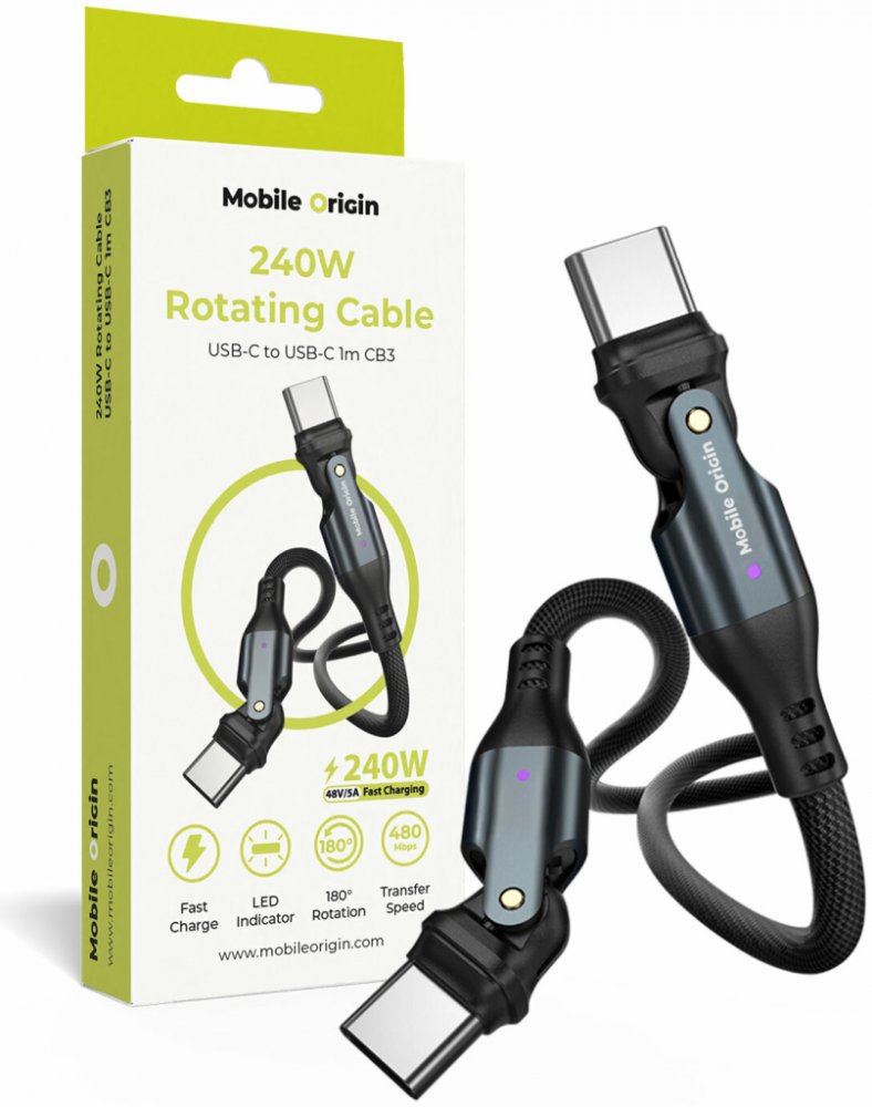 Mobile Origin 240W Rotating Cable USB-C to USB-C CB3Otočný USB-C kabel 240 W pro efektivní a flexibilní nabíjení notebooků, telefonů a tabletůMobile Origin 240W Rotating Cable USB-C to USB-C CB3 nabízí kompaktní řešení s oboustranně otočnými koncovkami a podporou rychlého nabíjení o výkonu až 240 W. Je vhodný především pro nabíjení notebooků, moderních telefonů a tabletů. Zajišťuje také přenos dat...