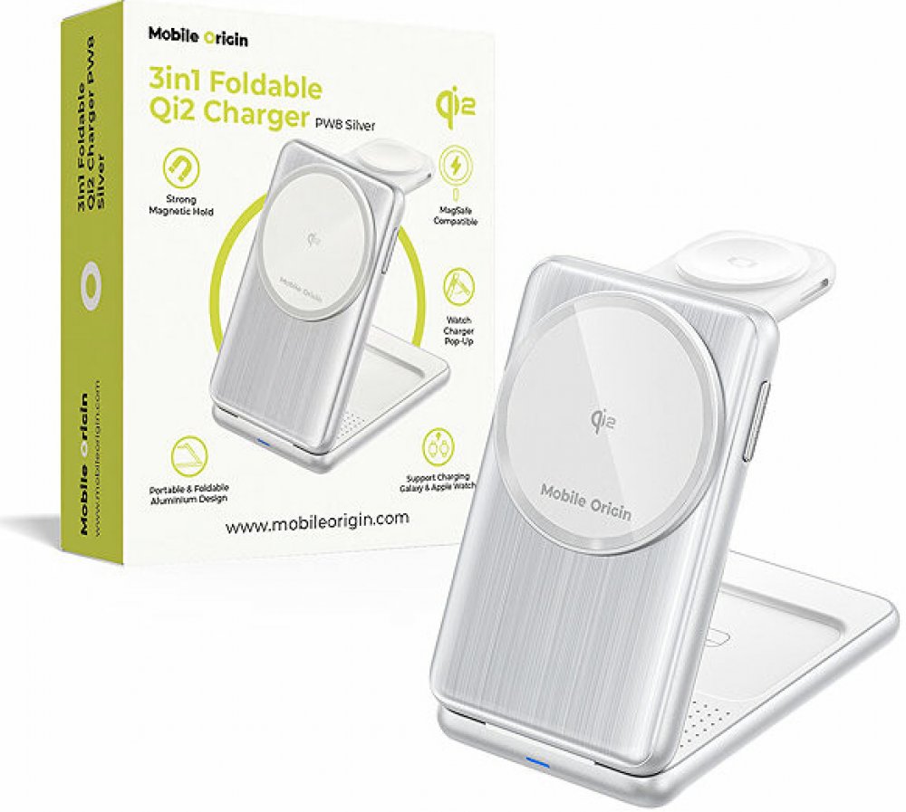 Mobile Origin 3in1 Foldable Qi2 Charger PW8 SilverBezdrátová nabíječka 3v1Nabíjecí stanice vám umožní pohodlně nabíjet až tři zařízení najednou – chytrý telefon, hodinky i bezdrátová sluchátka. Celkový nabíjecí výkon je 22,5 W, přičemž Mobile Origin 3in1 automaticky přizpůsobí výkon potřebám vašeho zařízení. Nabíjení usnadňuje kompatibilita s technologií Qi2 a MagSafe.Klíčové vlastnosti bezdrátové...