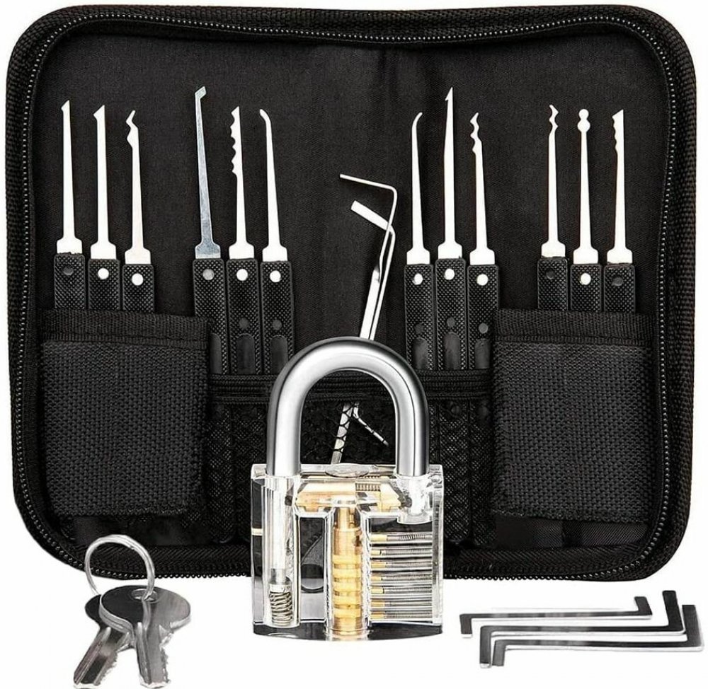 Lockpickingová sada v pouzdru s 12 planžetami a 5 různými napínáky. Součástí balení je trénovací zámek.