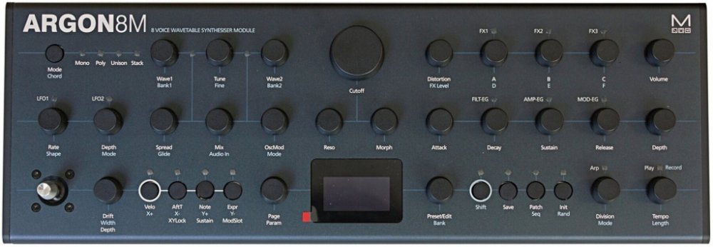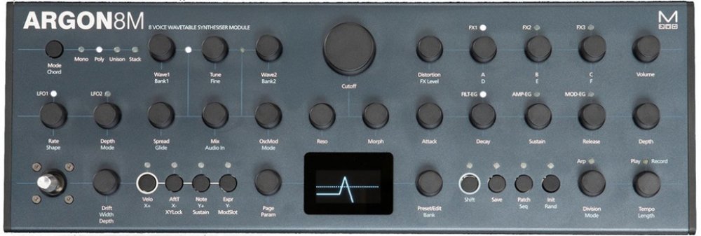 Argon8M osmihlasý wavetable polyfonní syntezátor. Disponuje 120 pečlivě vytvořenými wavetable průběhy rozdělenými do pěti sad a 32 oscilátory s 8 různými možnostmi nastavení modulace včetně Phase Mod (FM), Ring Mod, Amp Mod, Hard Sync či windowed Sync. Syntezátor navíc poskytuje ovladače Voice Drift a Width, které vytvářejí masivní stereo zvuky. Dvoupólový morfovací rezonanční filtr lze nastavit od low pass přes band pass až po high pass. K dispozici je Matrix modulace s osmi přiřaditelnými sloty a 4-osým joystickem s možností uzamčení v případě potřeby. Argon8M nabízí real time sekvencer s 512 kroky se vstupní kvantizaci a čtyřmi animacemi upravitelných parametrů. Paměť poskytuje až 500 plně editovatelných slotů s 300 továrními programy a 200 uživatelskými patch sloty. Syntezátor Argon8M navíc disponuje jack konektory pro stereofonní zvuková zařízení, sluchátka nebo externí ovládání sustain a expression. Zajišťuje kompatibilní MIDI prostřednictvím USB připojení k hostitelskému počítači nebo tabletu. Napájení: DC-9,0V-1,5A.