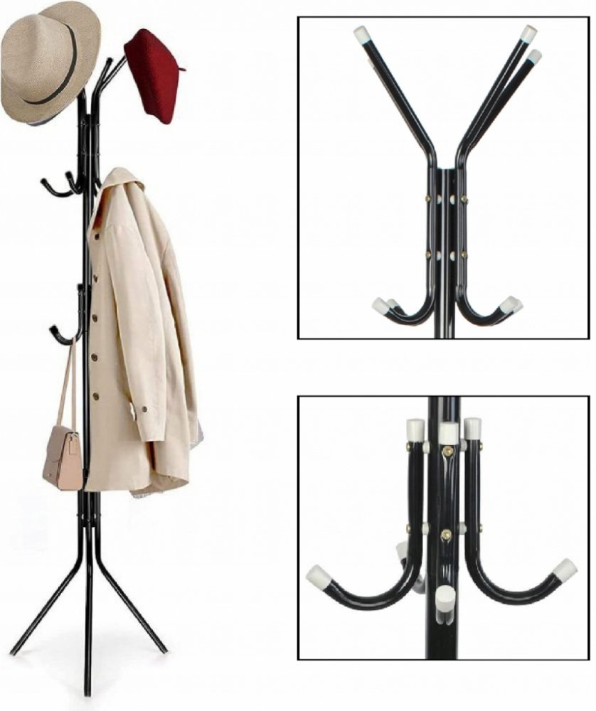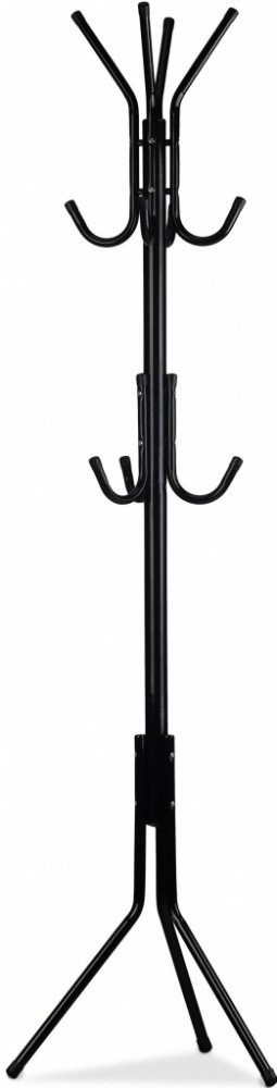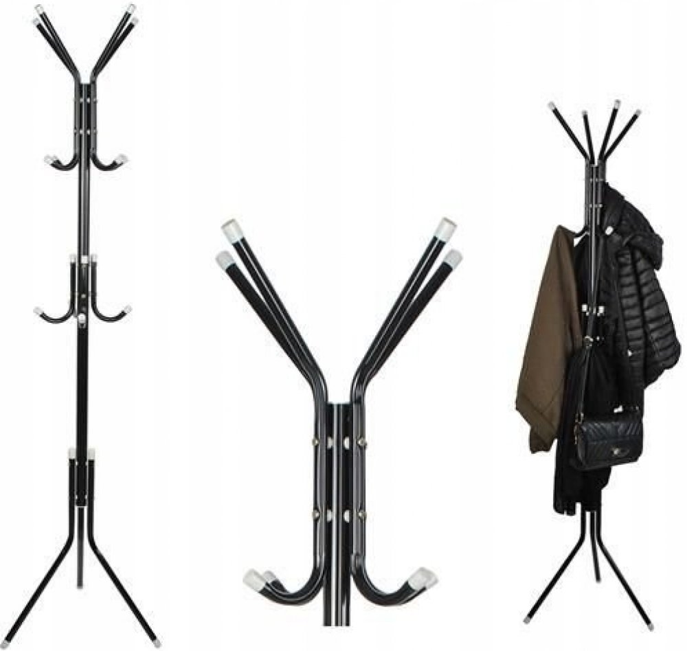 Stojací věšák na šaty je skvělým doplňkem do interiéru haly nebo kanceláře. Konstrukce věšáku je vyrobena z práškově lakované oceli s plastovými prvky. V horním vrchlíku stojanu najdete 4 ramena a na každém z nich 2 místa na zavěšení oblečení. V polovině výšky jsou také menší háčky, na které lze pověsit čepice nebo bundy pro malé děti. Nohy věšáku jsou zakončeny speciálními patkami, které zabraňují poškrábání povrchu.