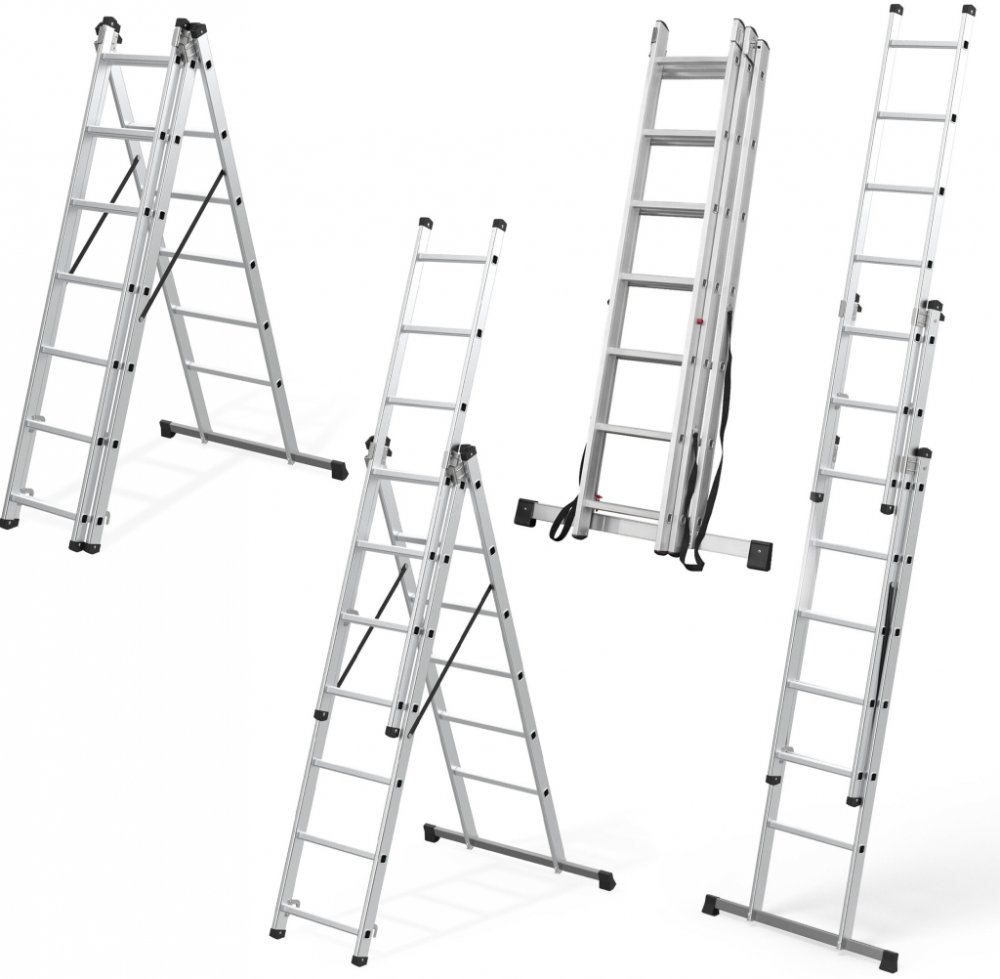 Univerzální hliníkové štafle 3x7 od ModernHome pro domácnost, dílnu i zahradu. Nabízí 2 pracovní konfigurace (opěrné i samostojné A), lehkou a korozivzdornou konstrukci, protiskluzové patky a bezpečnostní popruhy. Snadno se skládají, převáží a skladují, mají krokové nastavení výšky a nosnost 150 kg.
