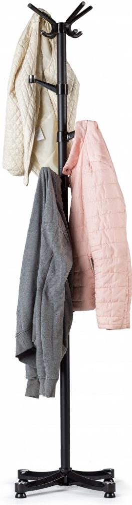 Praktický stojací věšák na oblečení v černém provedení s práškovým lakem a stromovým designem. Nabízí celkem 14 háčků – 8 horních pro kabáty a bundy, 6 přídavných nižších ideálních pro děti, tašky nebo menší doplňky. Široce rozmístěná čtyřnohá základna zajišťuje vysokou stabilitu i při plném zatížení. Perfektní do předsíně, šatny, ložnice, kanceláře nebo čekárny.