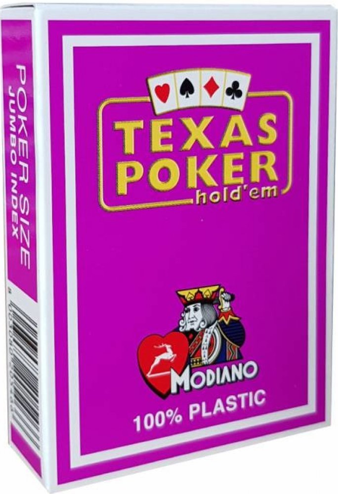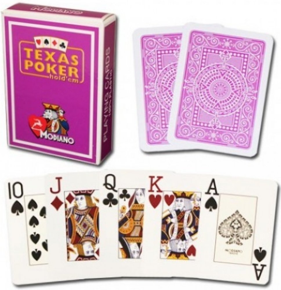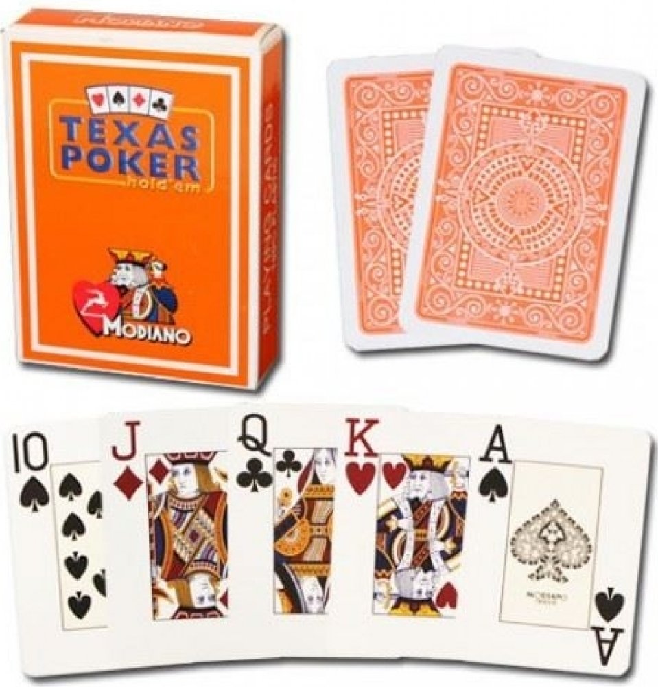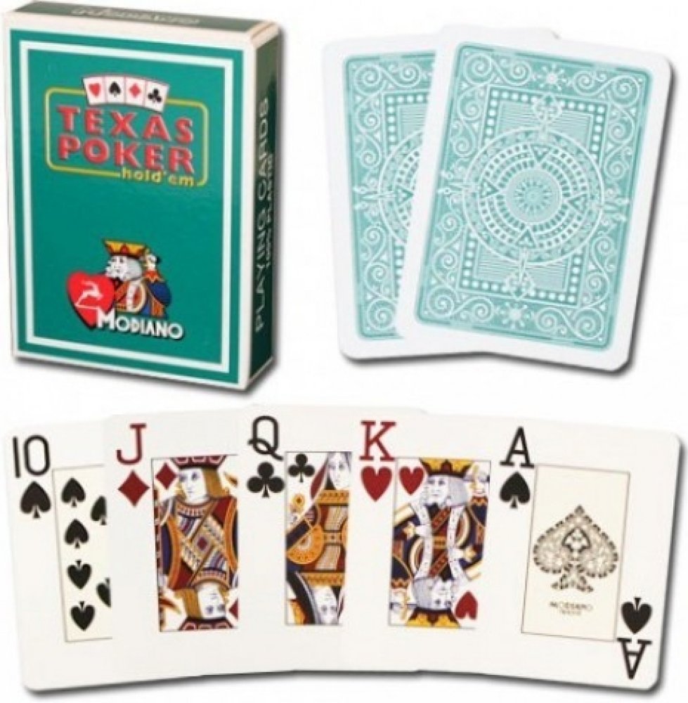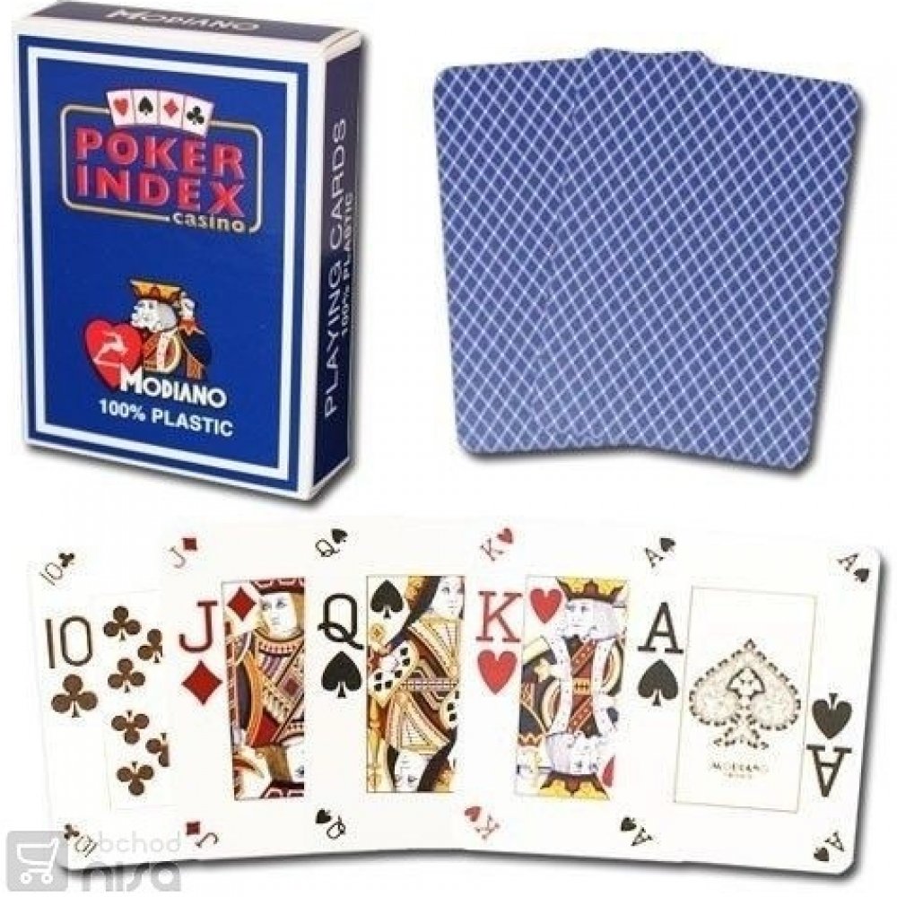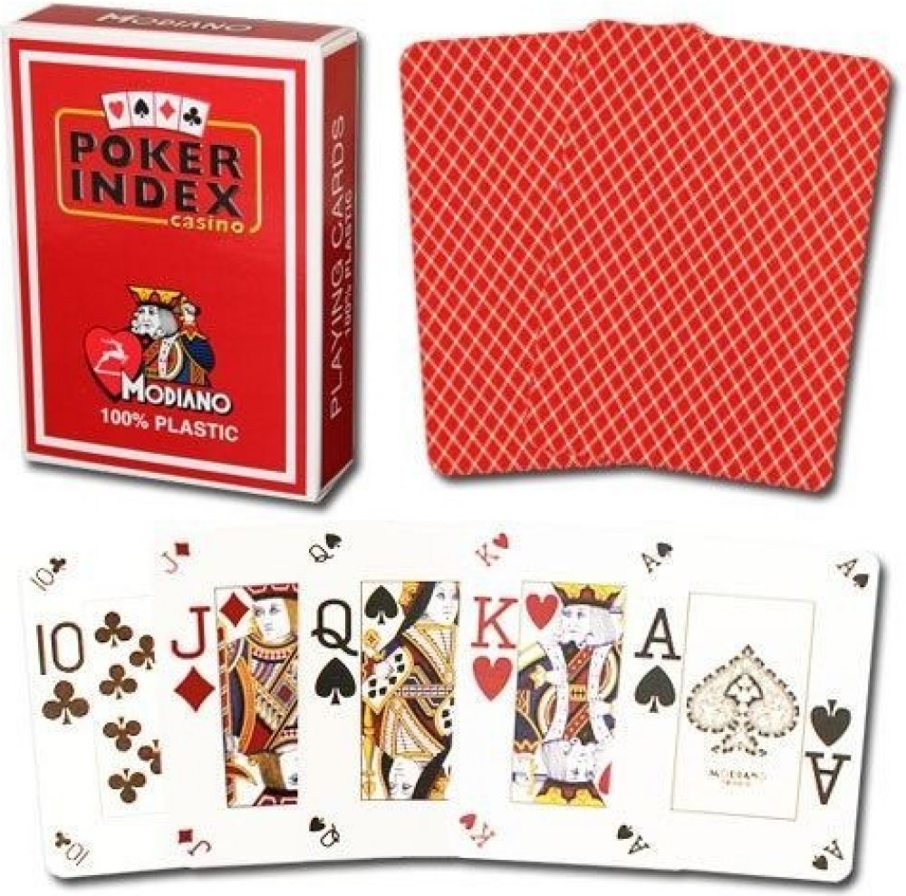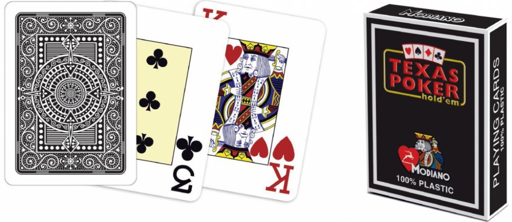 Kvalitní pokerové karty ze 100% plastu oblíbené značky Modiano. Karty mají klasický širokoúhlý formát, jsou 8,89 cm vysoké a 6,35 cm široké. Karty jsou dvourohé - tedy v protilehlých rozích je uvedena hodnota karty. Modiano karty jsou velice oblíbené u pravidelných hráčů pro svou vysokou životnost a odolnost. Díky složení ze 100% plastu vydrží tyto karty 100 krát více her než karty papírové nebo pouze s plastovým potahem. Karty jsou omyvatelné, vodotěsné a pyšní se svou dlouhou životností.