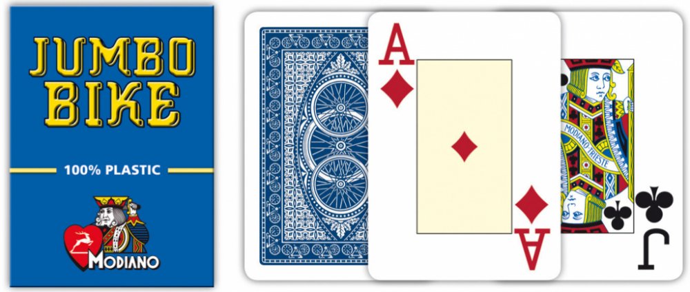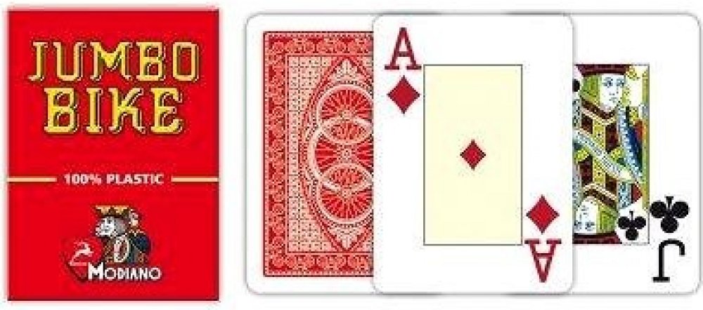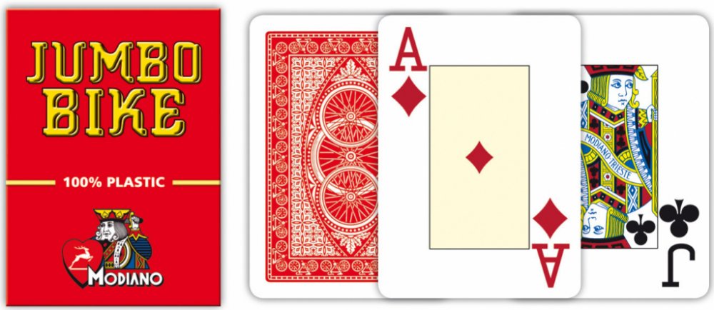 Karty Modiano Poker Bike Trophy - 2 Jumbo Index jsou určené pro hraní pokeru doma i v kasinu. Vyrobené jsou z velmi kvalitního PVC, které zajistí jejich dlouhou životnost a skvělou odolnost i při častém používání. Karty jsou navíc díky výrobě z plastu omyvatelné a balení obsahuje 54 karet. Karty Modiano Poker Bike Trophy jsou vhodné pro všechny hráče pokeru. Klíčové vlastnosti profi plastových kar...