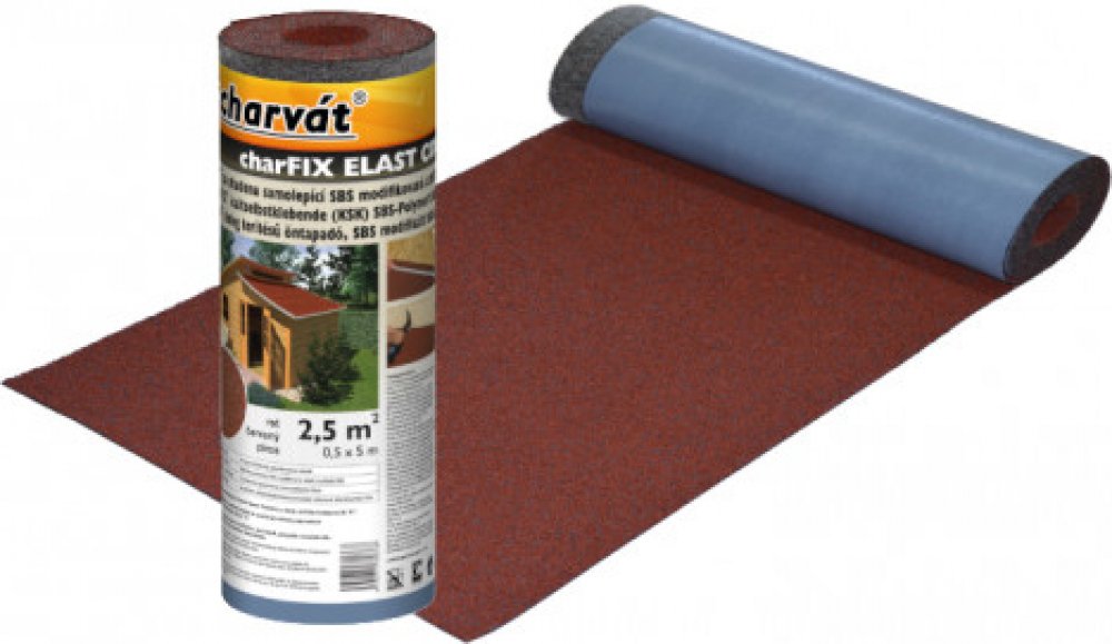 Modifikovaný asfaltový pás CHARVÁT CharFIX ELAST COOLnaStřešní asfaltový pás ELAST COOL je za studena samolepící SBS modifikovaná asfaltová krytina s nenasákavou nosnou vložkou z polyesterového rouna. Spodní povrch této asfaltové střešní krytiny je opatřen separační silikonovou snímatelnou folií, horní povrch tvoří barvený granulát. Lehce aplikovatelná samolepící asfaltová krytina se používá pro střechy zahradních domků, pergol, přístřešků pro automobily a apod., s min. sklonem střech 7°. Velkou výhodou je snadná a rychlá pokládka, kde se pásy připevňují lepenkovými hřebíky a k podkladu se přichytávají za studena pomocí samolepícího SBS asfaltu na spodní straně pásu. Vhodným podkladem pod střešní asfaltový pás jsou OSB desky, multifunkční panely z dřevěných třísek nebo i palubková prkna. Pro tvorbu střešní konstrukce můžeme také nabídnout široký výběr okapovým systémů.Technické vlastnosti: Rozměr: 0,5 x 5 m Tloušťka: 3,3 mm Pevnost: 900±200/700±200 N/50 mm Tažnost: 45±10/45±10 % Teplotní stabilita: 110 °C Druh nosné vložky: polyesterové rouno Úprava spodní vrstvy: snímatelná folie Úprava vrchní vrstvy: barvený granulát Krycí vrstva: SBS modifikovaný asfalt Minimální teplota při pokládce 15°C Podélné a příčné přesahy pásů min. 10 cm