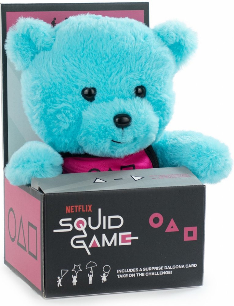 Postava Modrého medvídka z korejského seriálu Squid Game. Postavička je vhodná pro fanoušky jakéhokoliv věku tedy od 0+. Velikost postavičky je cca 28 cm. Jedná se o oficiálně licencovaný produkt španělské firmy Barrado, která je vyrábí v Číně.