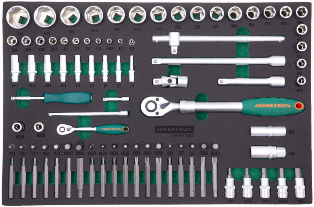 Pěnový modul EVA, vel. „C“ (570 x 380 mm): Rozsáhlá gola sada 95 dílů s ráčnou a příslušenstvím, vodicí čtyřhrany 1/4” a 1/2” – JONNESWAY S04H4295SVPraktická sada nářadí pro profesionály. Obsahuje všechny základní velikosti ořechů, které uživatel v dílně či autoservisu využije. K tomu nabízí bohatý výběr dalšího příslušenství – bity, klíče na svíčky, vratidla atd. Vše je v profesionální kvalitě a zabalené v praktickém pořadači. Každá součást soupravy v ní má svoje místo, a navíc máte přehled, zda něco nechybí. Sadu (modul) lze využít jako vybavení pro nářaďové dílenské vozíky značky JONNESWAY nebo QUATROS, případně i samostatně. Sestava obsahuje:- 11× nástrčná hlavice 1/4”, 6hranná, velikosti: 4 – 5 – 5.5 – 6 – 7 – 8 – 9 – 10 – 11 – 12 – 13 mm- 9× nástrčná hlavice 1/4” prodloužená, 6hranná, velikosti: 5 – 6 – 7 – 8 – 9 – 10 – 11 – 12 – 13 mm- 1× ráčna 1/4”- 2× prodloužení 1/4”, délky 50 mm a 150 mm- 1× nástavec s rukojetí (šroubovák) 1/4”- 19× nástrčná hlavice 1/2”, 6hranná, velikosti: 10 – 11 – 12 – 13 – 14 – 15 – 16 – 17 – 18 – 19 – 20 – 21 – 22 – 23 – 24 – 26 – 27 – 30 – 32 mm- 2× nástrčná hlavice na zapalovací svíčky, velikosti 16 mm a 21 mm- 2× prodloužení 1/2”, délky 125 mm a 250 mm- 1× ráčna 1/2” s nastavitelnou délkou- 1× vratidlo 1/2”, délka 250 mm- 1× kloub – kardan 1/2”- 5× zástrčná hlavice Imbus 1/2”, velikosti: H5 – H6 – H8 – H10 – H12- 7× bit Imbus, délka 30 mm, velikosti: H4 – H5 – H6 – H7 – H8 – H10 – H12- 7× bit Imbus, délka 75 mm, velikosti: H4 – H5 – H6 – H7 – H8 – H10 – H12- 7× bit Torx, délka 30 mm, velikosti: T20 – T25 – T30 – T40 – T45 – T50 – T55- 7× bit Torx, délka 75 mm, velikosti: T20 – T25 – T30 – T40 – T45 – T50 – T55- 5× bit XZN („trojitý čtverec“), délka 30 mm, velikosti: M5 – M6 – M8 – M10 – M12- 5× bit XZN („trojitý čtverec“), délka 75 mm, velikosti: M5 – M6 – M8 – M10 – M12- 2× adaptér (redukce), velikosti: 1/2” 4hran × 10 mm; 3/8” 4hran × 10 mmRozměr modulu: 570 x 380 mm