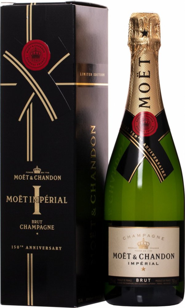 Oslavte výjimečné momenty se stejně výjimečným šampaňským! Moët & Chandon přichází při příležitosti 150. výročí ikony ve světě oslav Moët Imperial se vzrušující novinkou. Limitovaná edice Moët & Chandon Imperial Brut 150 Years Anniversary je označena památnou pečetí s písmenem "I" (Imperial) vydanou na oslavu dlouhé historie tohoto šampaňského. Toto nezapomenutelné výroční šampaňské Moët & Chandon Imperial Brut 150 Years Anniversary vyniká elegantní slámově-zlatavou barvou, příjemně svůdným perlením a jiskřivými tóny zahradního ovoce a citrusů. Odrůdové složení: obsahuje 30 - 40% pinot noir, 30 - 40% pinot meunier a 20 - 30% chardonnay. Barva: elegantní slámově zlatá se zelenkavým odleskem Vůně: jiskřivý buket s intenzivní vůní zeleného jablka a citrusů, svěží minerální podtóny, bílé květy, blond tóny (koláč, obiloviny, čerstvé oříšky) Chuť: luxusně delikátní tóny ovocných odrůd s bílou dužinou (hrušky, broskve, jablka), příjemně svůdné perlení, energické citrusy a angreštové podtóny