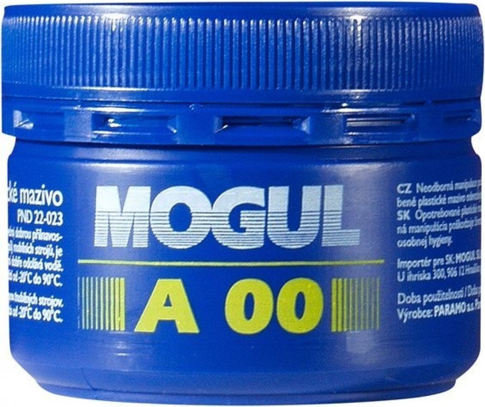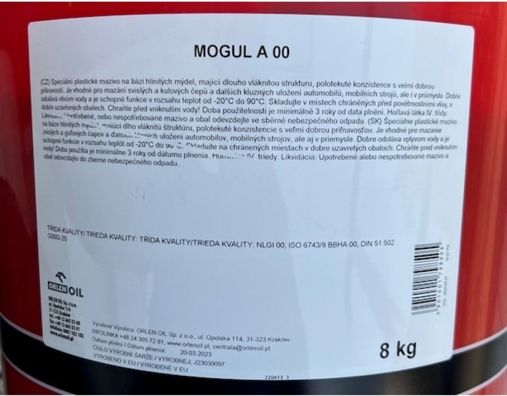 MOGUL A00 je plastické mazivo z ropného základového oleje s vysokou viskozitou, zpevněné hlinitým mýdlem a obsahující přísadu latexu. Mazivo má velkou přilnavost, tažnost a výbornou odolnost proti vodě. Má dlouhovláknitou strukturu a je polotekuté konzistence. Barva maziva je tmavozelená.