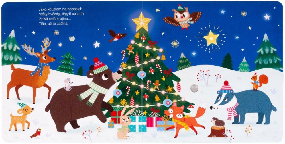 Když se v zasněženém zimním lese přiblíží Štědrý den, zvířátka už se začínají těšit na Vánoce. Pozorují hvězdy na obloze, naslouchají cinkotu zvonečků a rozhodnou se ozdobit stromeček. Nadílka už se blíží! Co pěkného si budou přát? Tato vánoční knížka ve verších se zvuky a blikajícími světýlky vám pomůže ponořit se do sváteční atmosféry. Společně s dětmi si předčítejte milé verše, poslouchejte zvuky lesa a užívejte si kouzelná světýlka. Ideální pro předvánoční pohodu a čekání na Ježíška.
