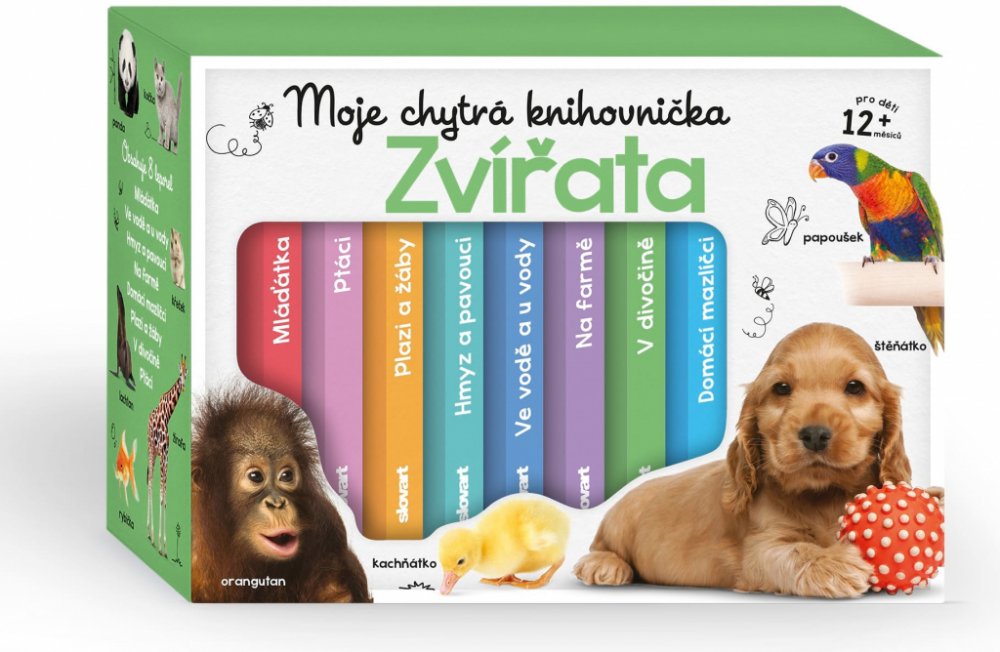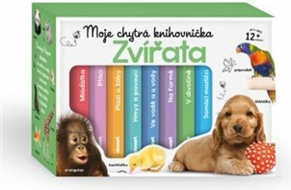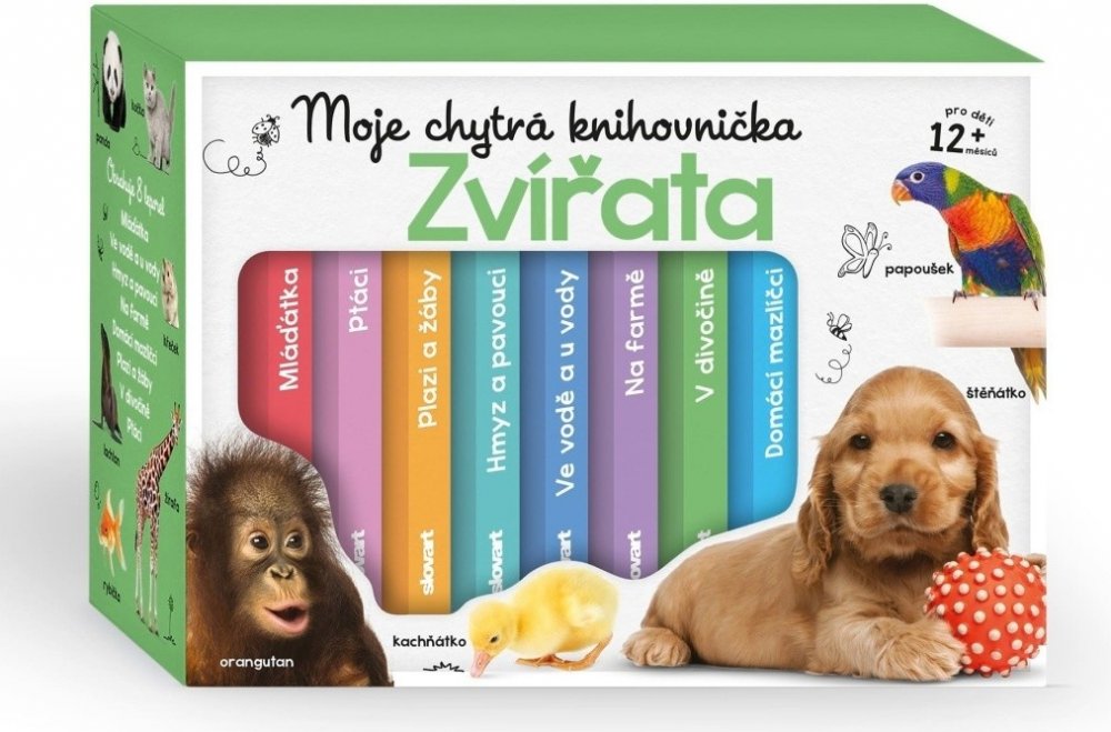 Popis : Soubor obsahuje osm malých leporel s poutavými barevnými obrázky běžných zvířátek z celého světa. Děti od jednoho roku se hravou formou seznámí se zajímavými živočichy. Pomocí obrázků a jejich pojmenovávání si postupně rozvíjí slovní zásobu a vytváří si vztah ke světu zvířat. Z leporel se dá vytvořit také zábavná skládačka. Moji chytrou knihovničku Zvířata tvoří knížečky s názvy Mláďátka, Ve vodě a u vody, Hmyz a pavouci, Na farmě, Plazi a žáby, V divočině, Ptáci, Domácí mazlíčci.Druh sortimentu : Kniha, Název : Moje chytrá knihovnička Zvířata, Jazyk : Čeština, Počet stran : 96